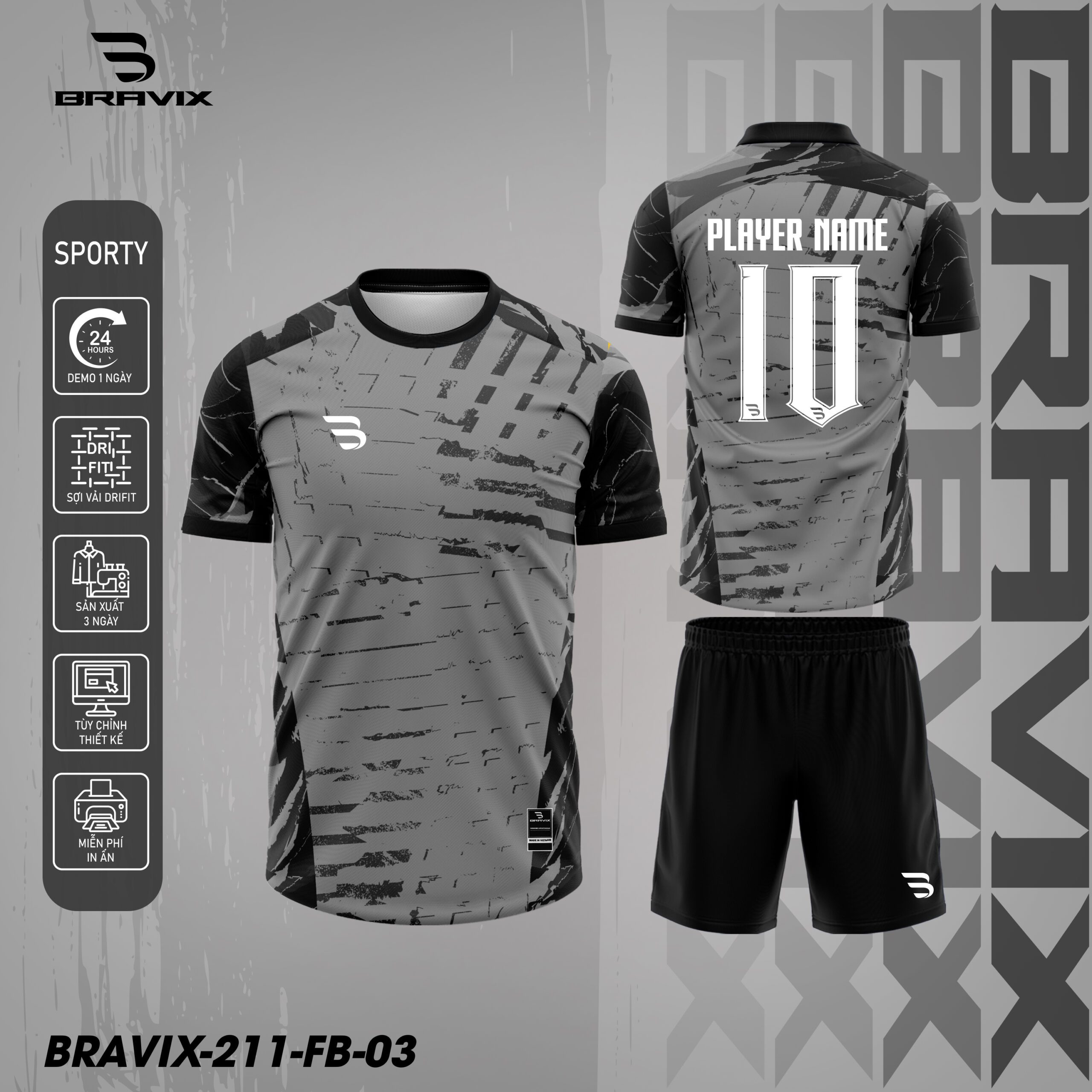 Bravix FB-03 mang phong cách tối giản nhưng đầy mạnh mẽ với gam xám – đen chủ đạo. Họa tiết scratch & glitch được bố trí tinh tế tạo cảm giác tốc độ, phá cách và cực kỳ phù hợp tinh thần bóng đá hiện đại. Đây là mẫu nằm trong bộ sưu tập Football độc quyền của Bravix, dành cho những đội bóng thích sự ngầu – chất – cá tính.