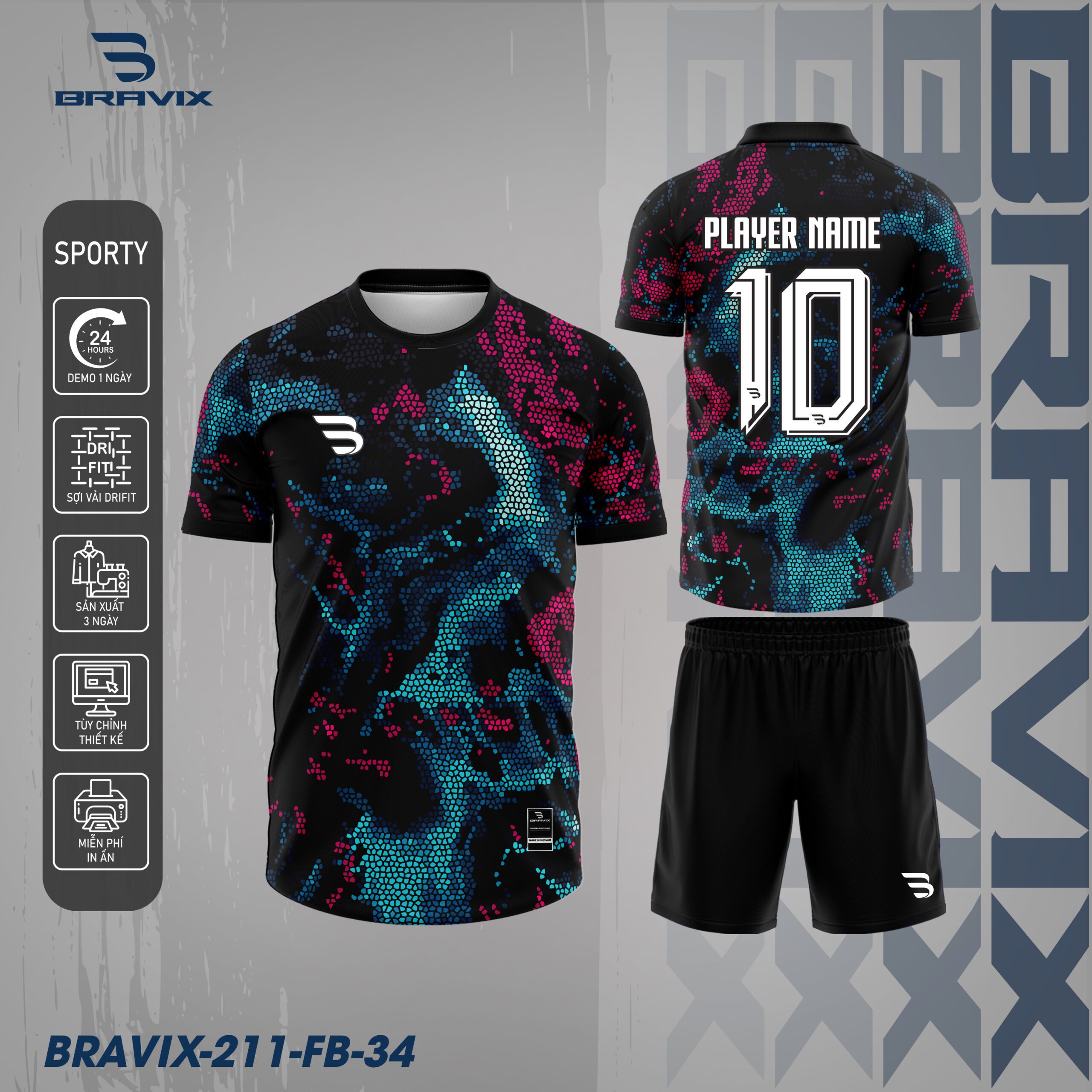 Bravix FB-34 mang phong cách đen phối xanh – hồng neon, tạo nên diện mạo cực kỳ nổi bật và cá tính trên sân bóng. Họa tiết dạng pixel galaxy được thiết kế loang khắp thân áo, tạo cảm giác như những dải năng lượng chuyển động mạnh mẽ.