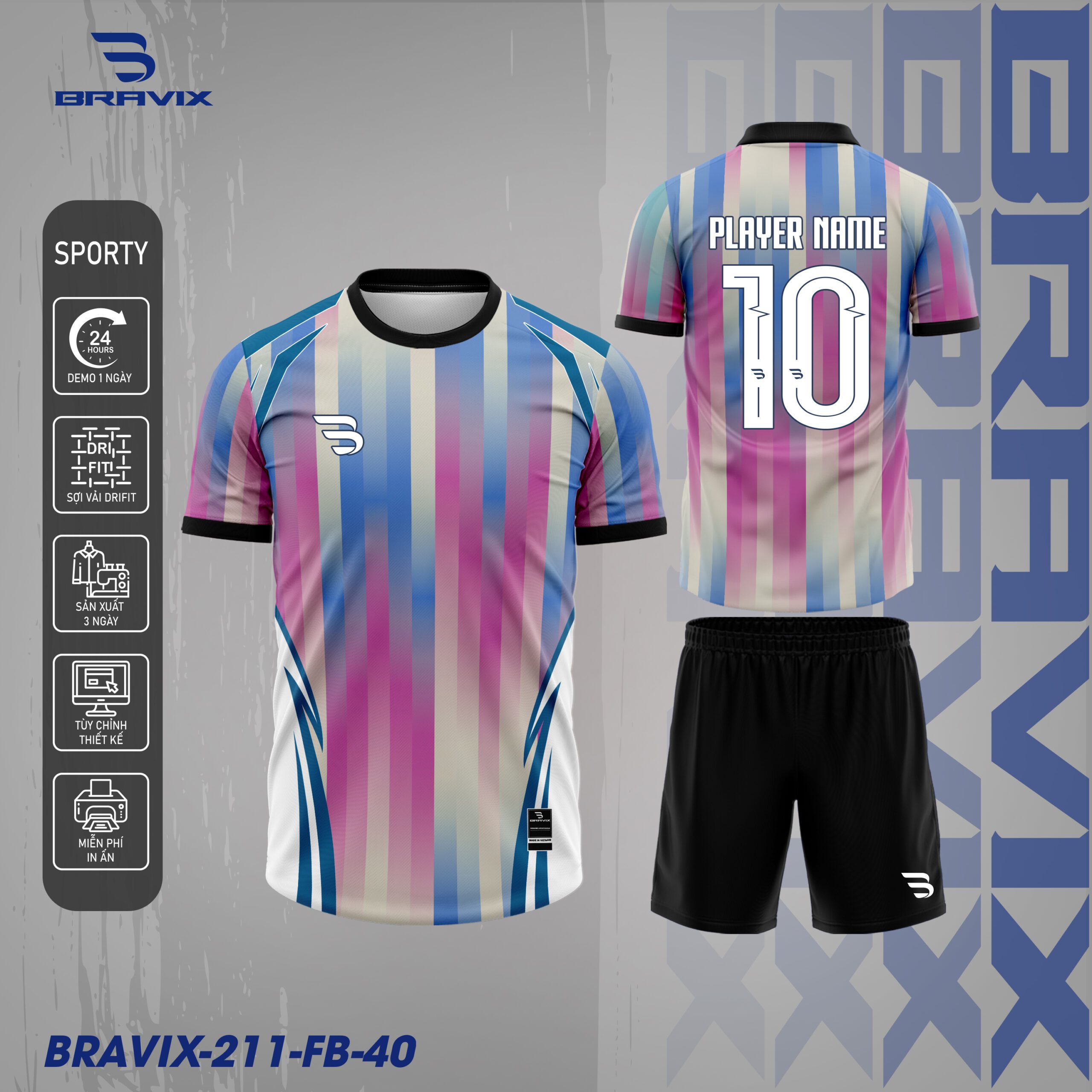Bravix FB-40 mang phong cách gradient pastel độc đáo, kết hợp giữa các gam màu xanh, hồng và kem tạo nên diện mạo cực kỳ trẻ trung và nổi bật trên sân bóng. Thiết kế chuyển màu dạng dọc giúp chiếc áo trông năng động và hiện đại hơn khi thi đấu.
