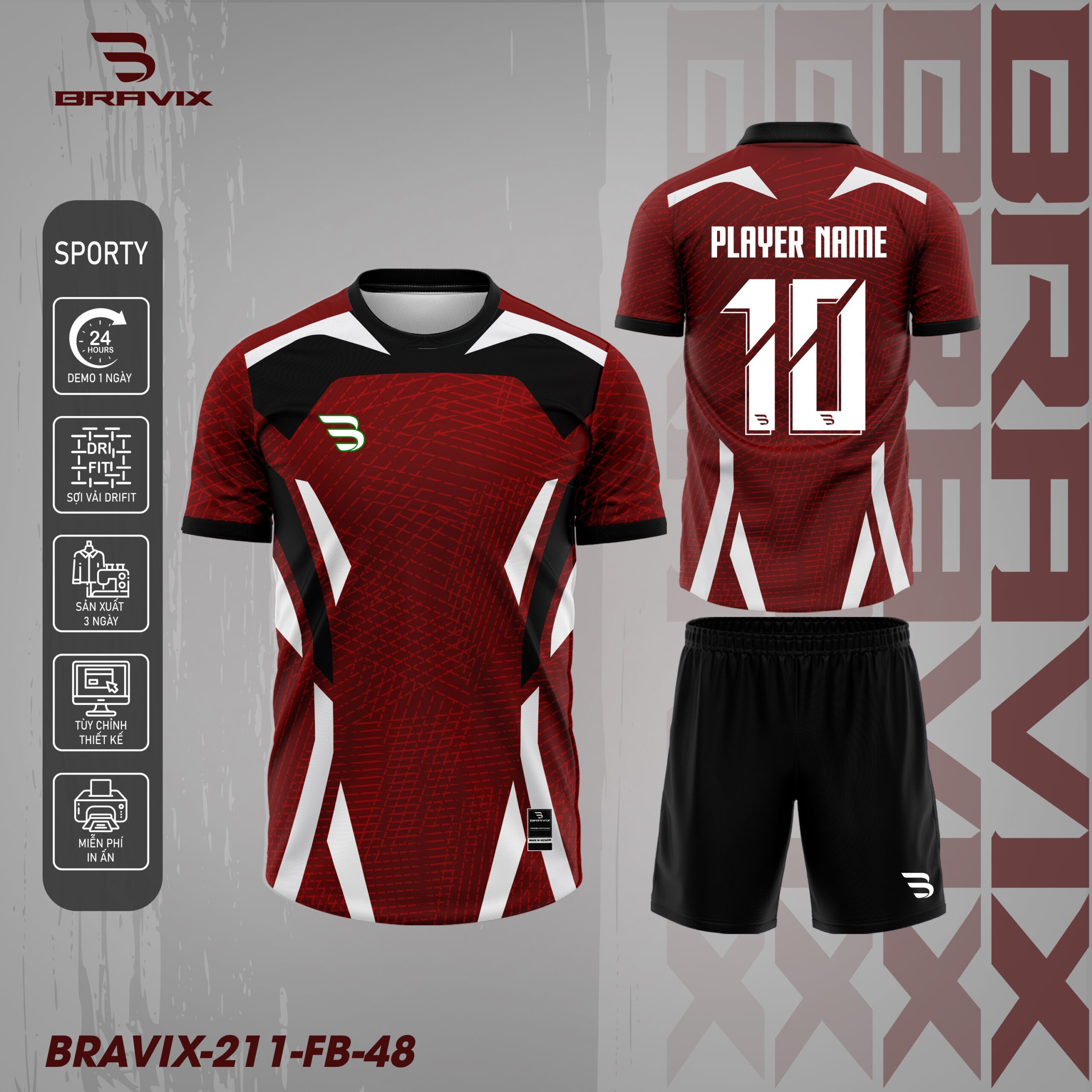 Bravix FB-48 gây ấn tượng với tông đỏ đô chủ đạo kết hợp các mảng đen – trắng tương phản, tạo nên phong cách thể thao mạnh mẽ và chuyên nghiệp. Những đường power line sắc nét chạy dọc thân áo giúp tổng thể thiết kế trở nên năng động và tạo cảm giác tốc độ khi thi đấu.