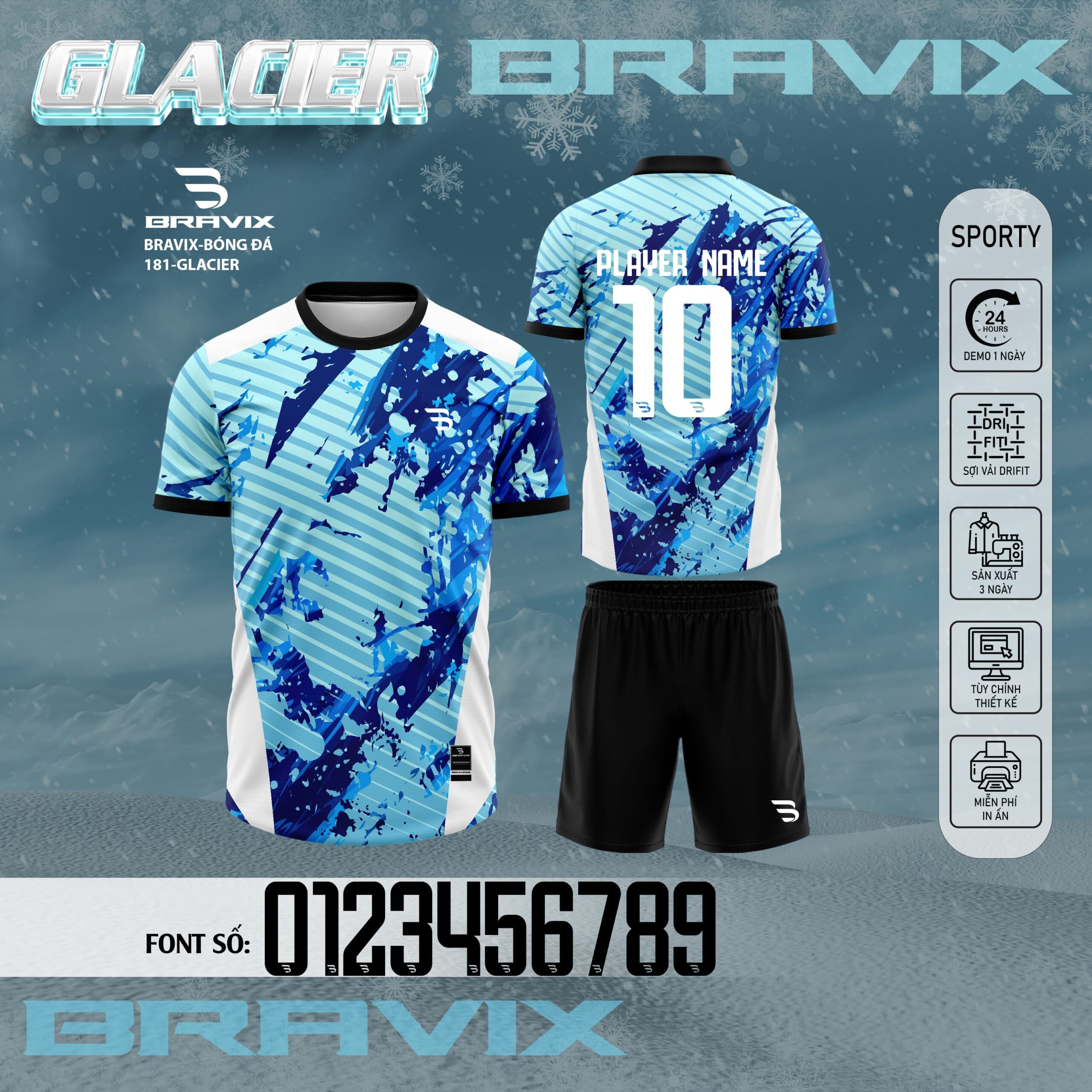 “Glacier” là mẫu áo bóng đá mang chủ đề băng giá – lạnh lùng – lạnh nhưng đầy khí chất. Lấy cảm hứng từ những mảng băng vỡ và sắc xanh lạnh sâu, mẫu áo đem đến cảm giác mạnh mẽ, tốc độ và sự bình tĩnh trong mọi trận đấu.