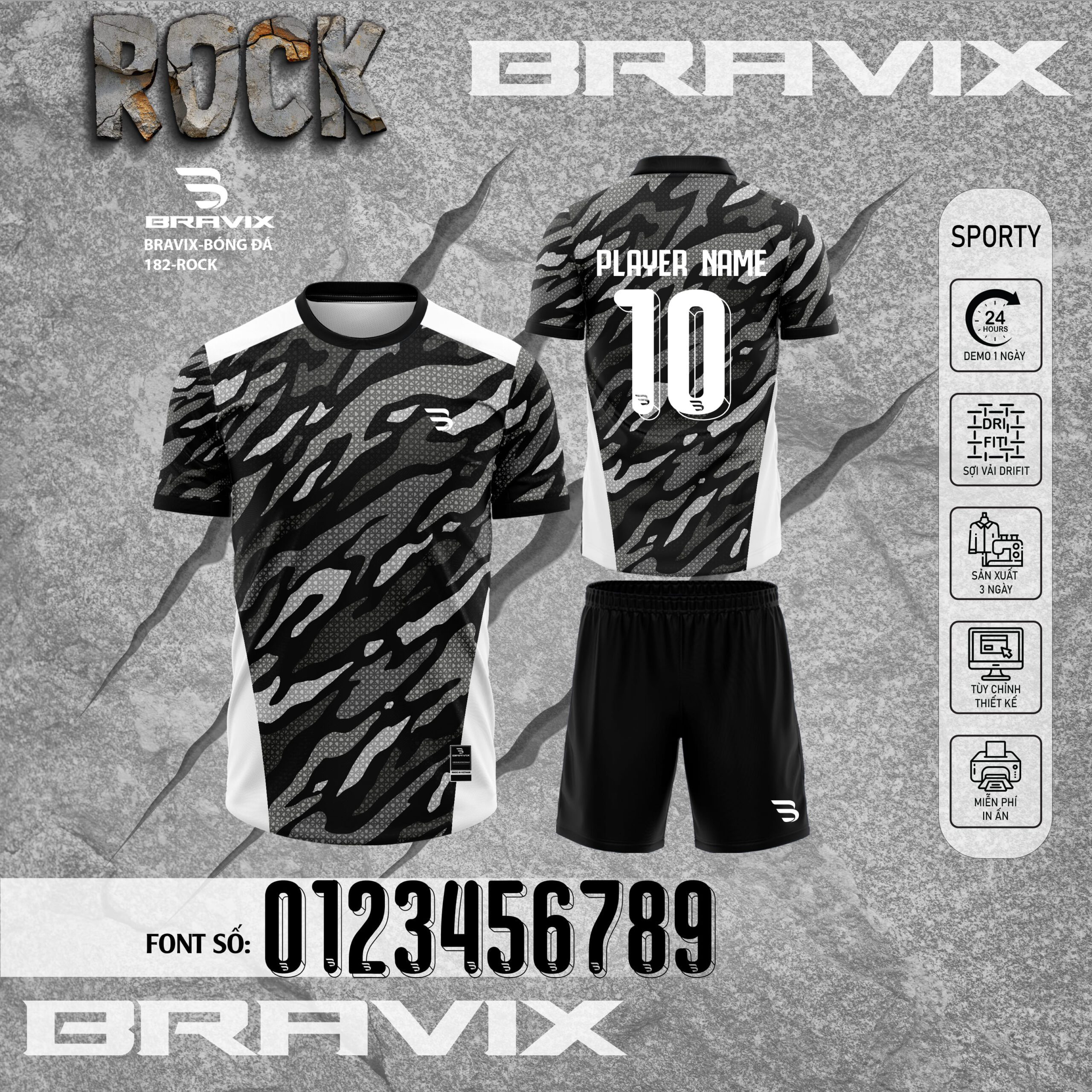 “Rock” là mẫu áo bóng đá mang phong cách đá tảng – chắc chắn – lì lợm, dành cho những đội bóng thi đấu bền bỉ và không ngại va chạm. Tone đen – xám kết hợp họa tiết răng cưa dạng “rock pattern” tạo cảm giác cứng cáp, mạnh mẽ như một chiến binh sân cỏ.