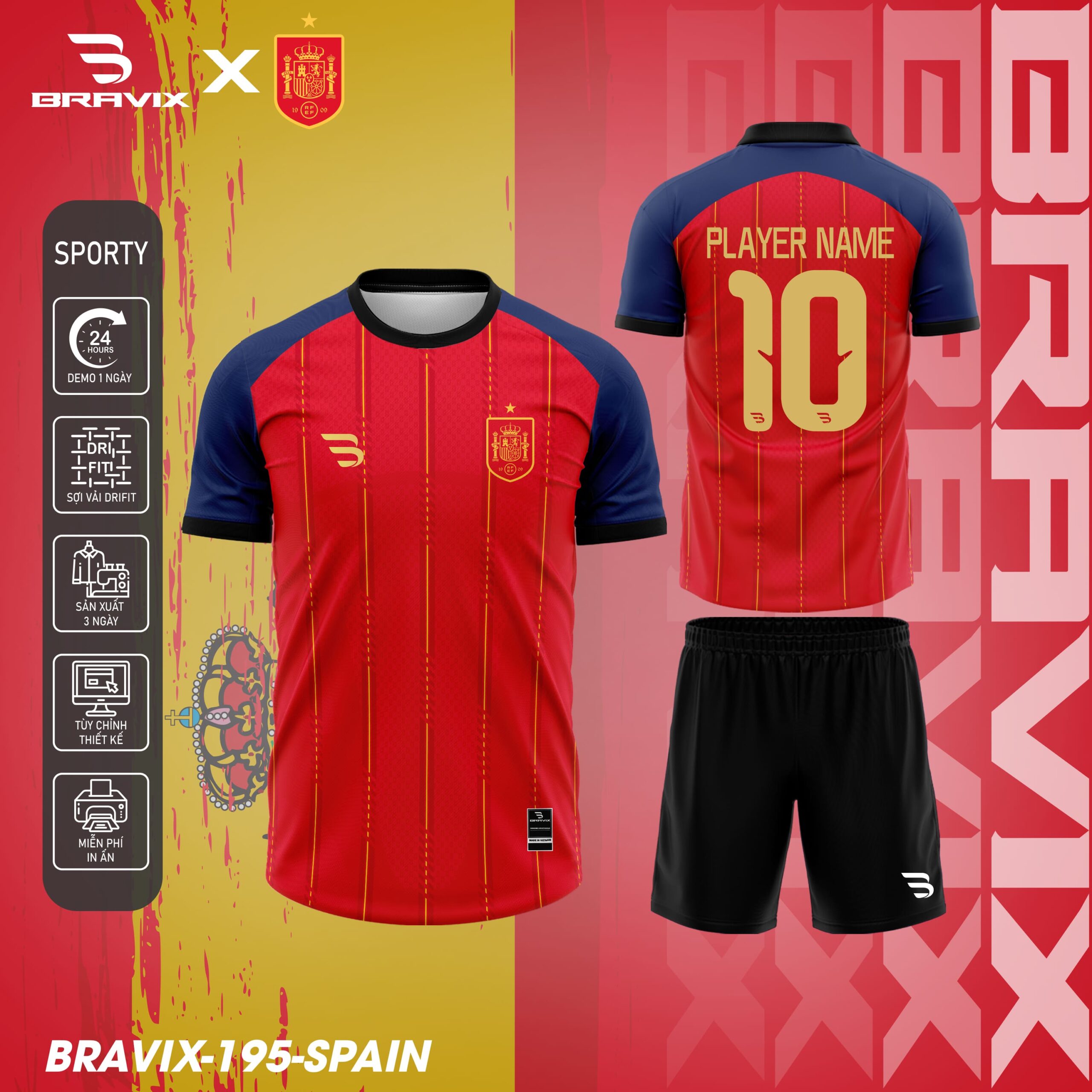 “Spain – World Cup Edition” là mẫu áo bóng đá mang tinh thần của La Roja – sắc đỏ rực lửa, vàng hoàng gia và phong thái của những chiến binh đấu trường World Cup. Thiết kế mô phỏng phong cách đội tuyển quốc gia Tây Ban Nha với những đường sọc vàng tinh tế, logo cách điệu và form dáng đậm chất quốc tế.