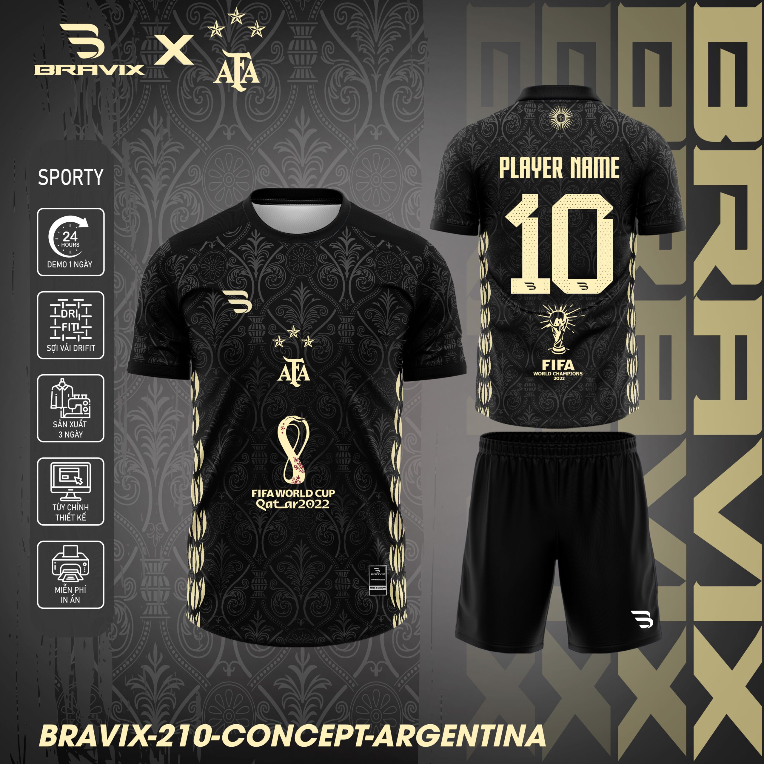 Bravix 210 Concept Argentina là mẫu áo bóng đá được thiết kế dựa trên cảm hứng từ chức vô địch World Cup của đội tuyển Argentina. Tông màu đen chủ đạo kết hợp cùng các chi tiết vàng gold mang lại cảm giác sang trọng, mạnh mẽ và đậm chất nhà vô địch.