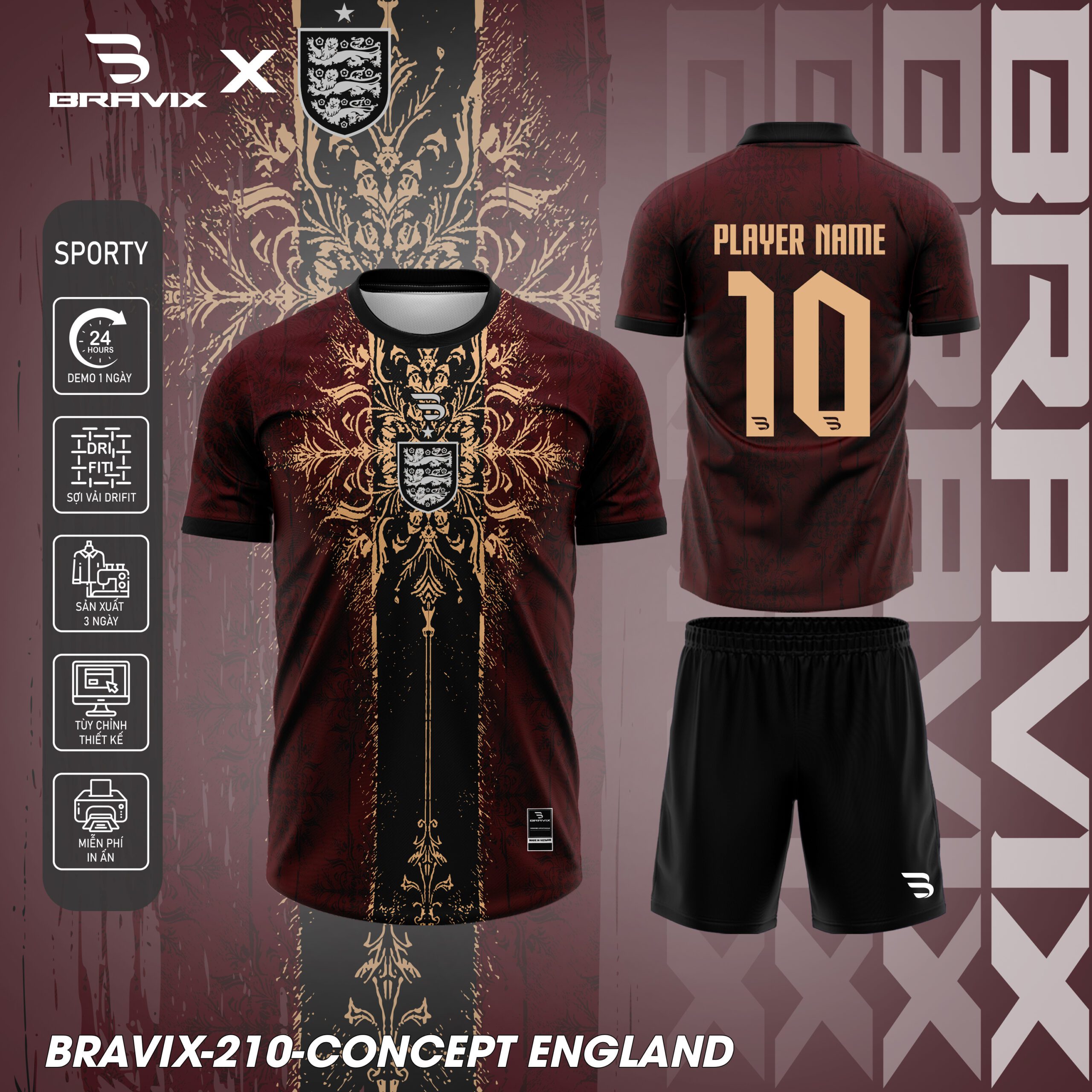 Concept England thuộc bộ sưu tập Bravix Collab Collection, nơi Bravix hợp tác ý tưởng để tái hiện bản sắc của các quốc gia thông qua ngôn ngữ thiết kế độc đáo. Với mẫu England, cảm hứng được lấy từ hoạ tiết hoàng gia – cổ điển – quyền lực, kết hợp tinh thần bóng đá Anh mạnh mẽ và truyền thống lâu đời.