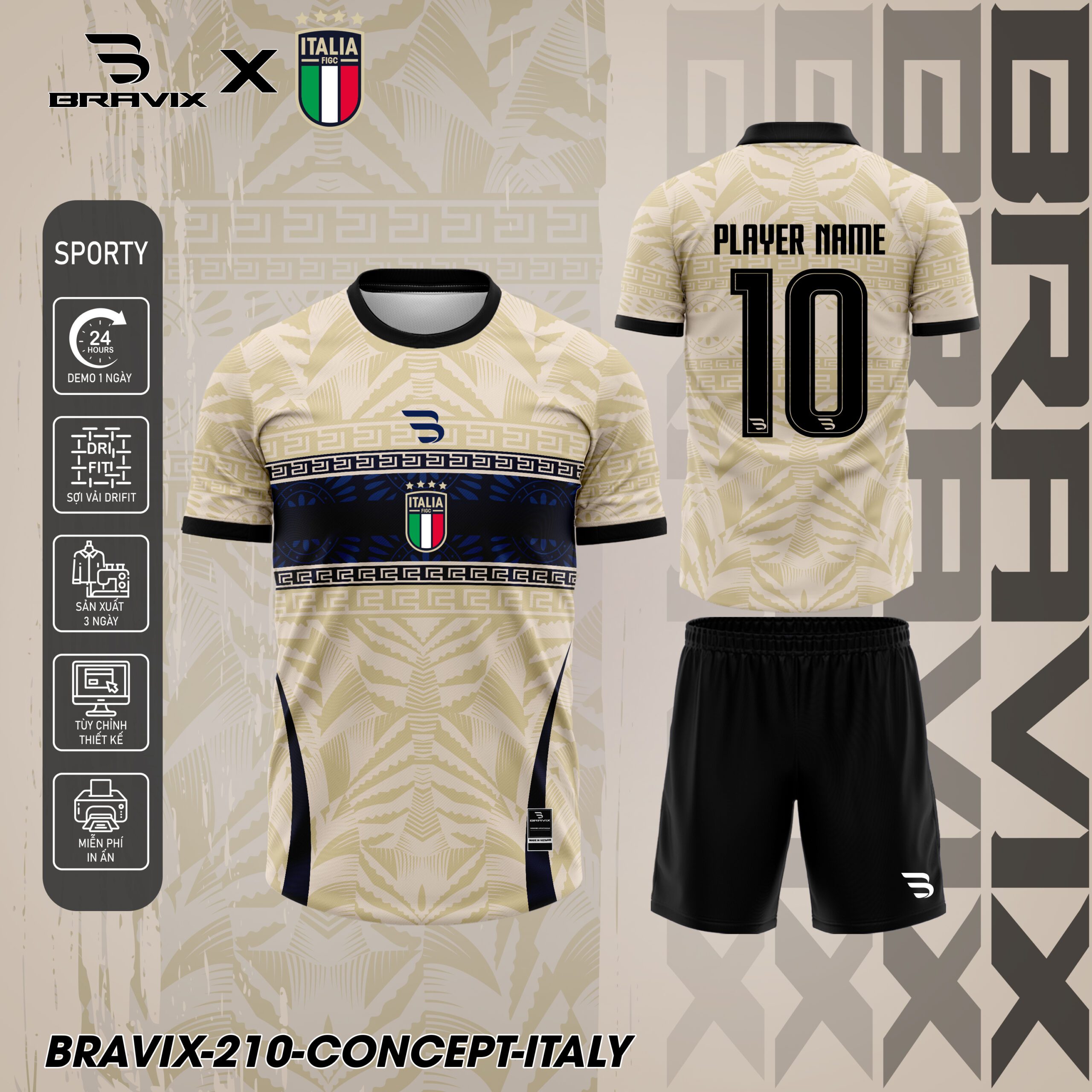 Bravix 210 Concept Italy là mẫu áo bóng đá được thiết kế lấy cảm hứng từ phong cách thanh lịch và đậm chất nghệ thuật của bóng đá Ý. Tông màu trắng kem chủ đạo mang lại cảm giác sang trọng và tinh tế, kết hợp cùng các chi tiết xanh navy và đen tạo nên một tổng thể hài hòa và hiện đại.