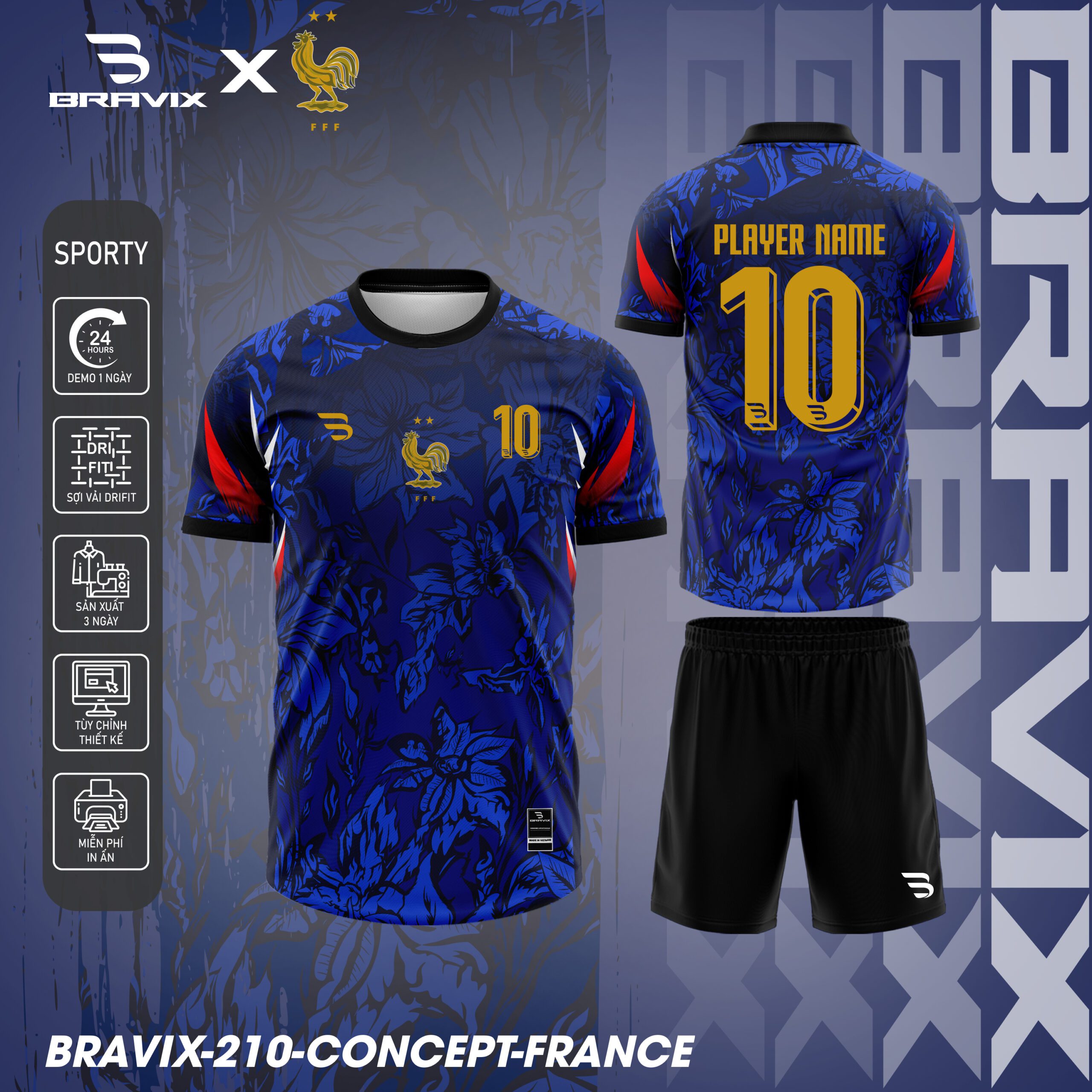 Blue Flora Edition thuộc bộ sưu tập Bravix Collab Concept, mang đến một cách tiếp cận mới mẻ cho sắc xanh truyền thống của đội tuyển Pháp. Mẫu áo nổi bật với họa tiết hoa văn ẩn phối cùng ánh xanh đậm, tạo cảm giác sang trọng nhưng cũng đầy khí chất chiến binh.