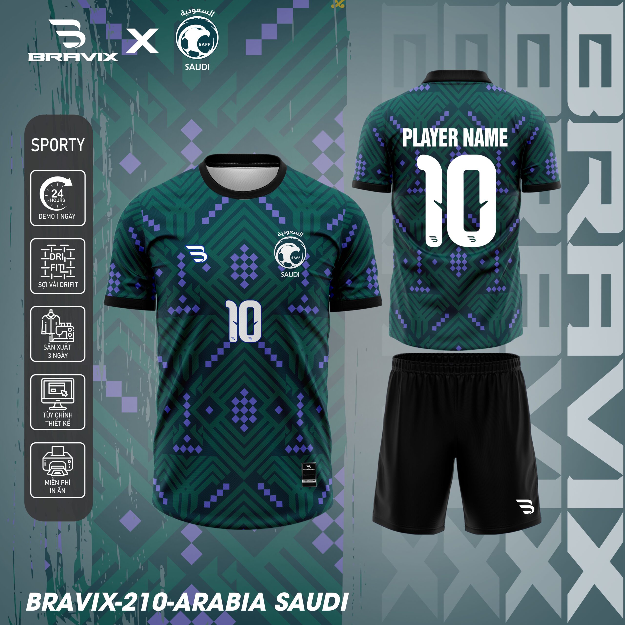 Mẫu Saudi Arabia World Cup BRAVIX-210 nổi bật với tông xanh lá đậm đặc trưng của đội tuyển Ả Rập Xê Út, kết hợp cùng các họa tiết hình học màu tím và xanh dương tạo hiệu ứng thị giác mạnh mẽ. Thiết kế mang phong cách hiện đại, lấy cảm hứng từ nghệ thuật hình học Trung Đông, giúp chiếc áo vừa mang bản sắc văn hóa vừa rất phù hợp cho môi trường thi đấu thể thao.