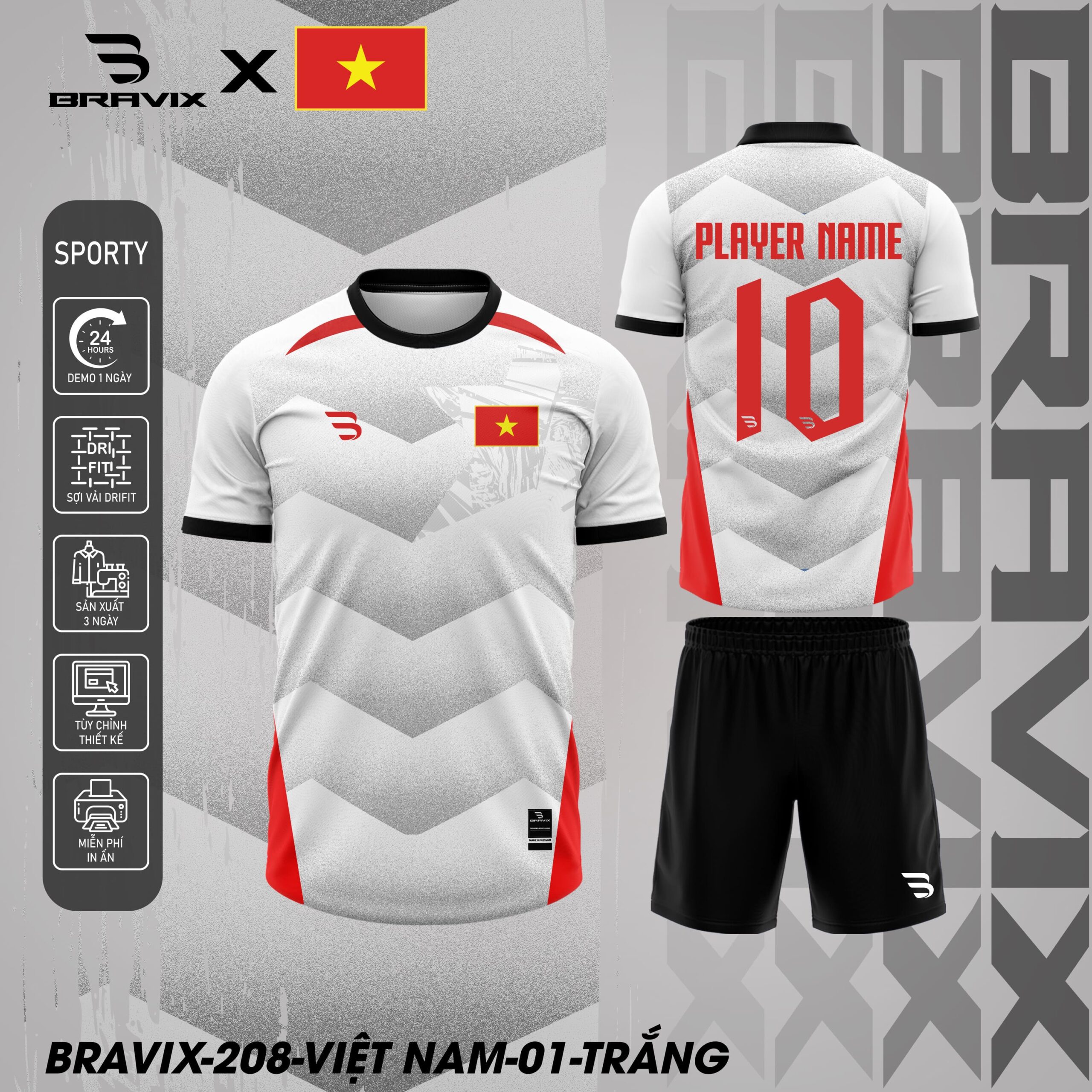 • Việt Nam 01 – Trắng: phối trắng tinh gọn – hiện đại, chi tiết đỏ tinh tế, phù hợp thi đấu & tập luyện.