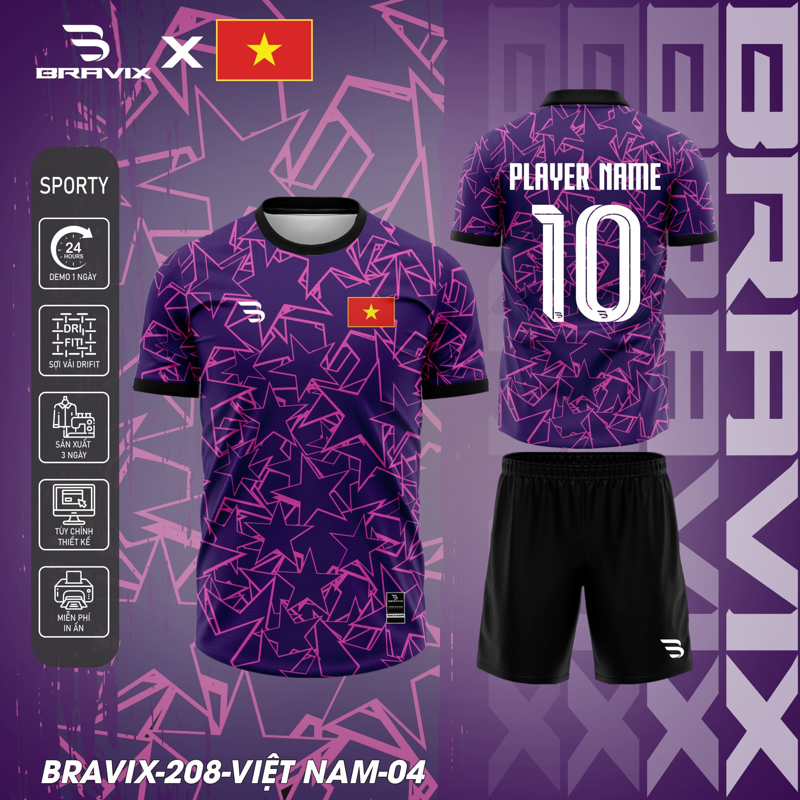 Việt Nam 04 là mẫu áo bóng đá mang phong cách mạnh mẽ, hiện đại cùng họa tiết ngôi sao cách điệu phủ tràn thân áo. Bravix sử dụng ngôn ngữ thiết kế phá cách với các đường nét hình học liên kết tạo thành một tổng thể độc đáo, phù hợp cho đội bóng yêu thích sự nổi bật và cá tính.