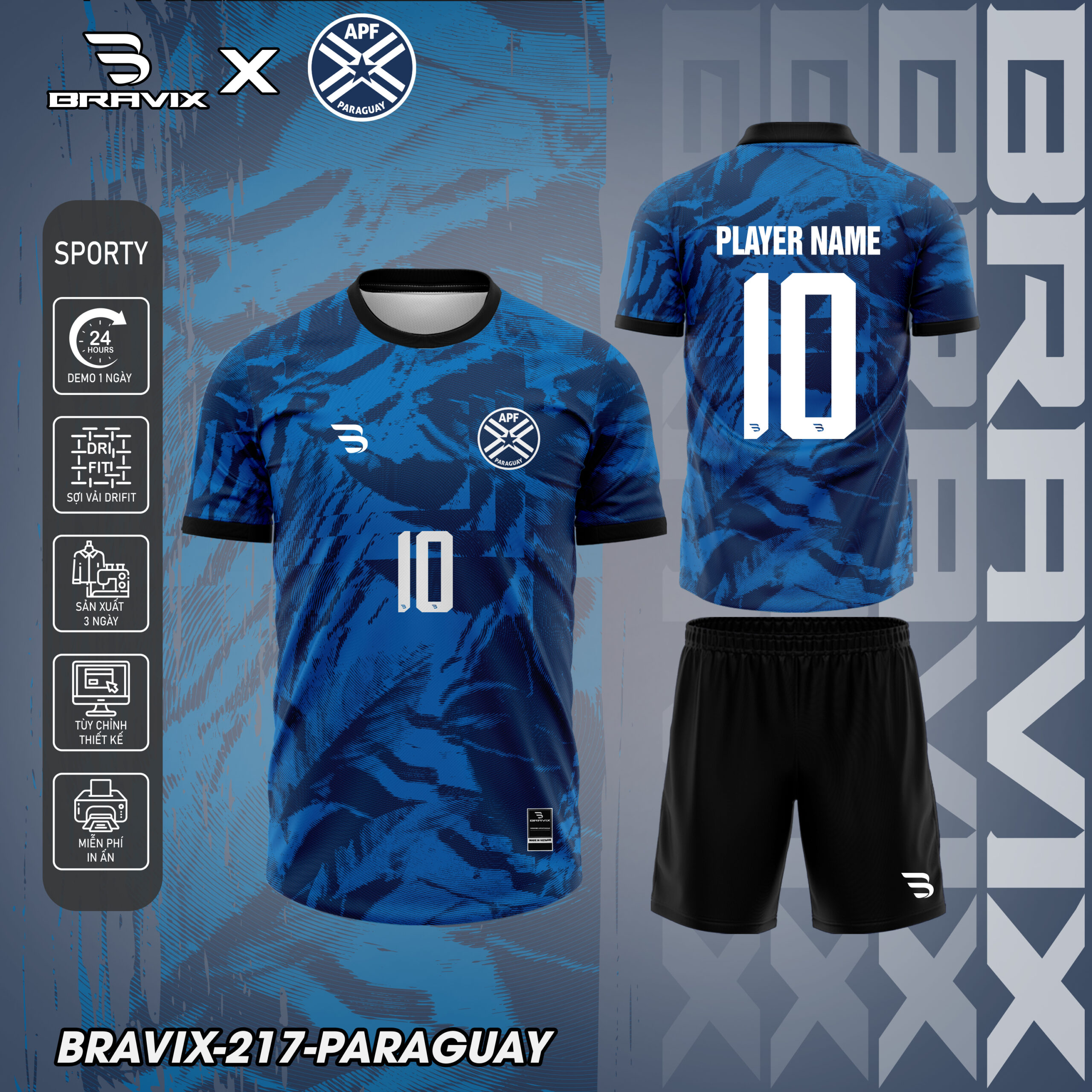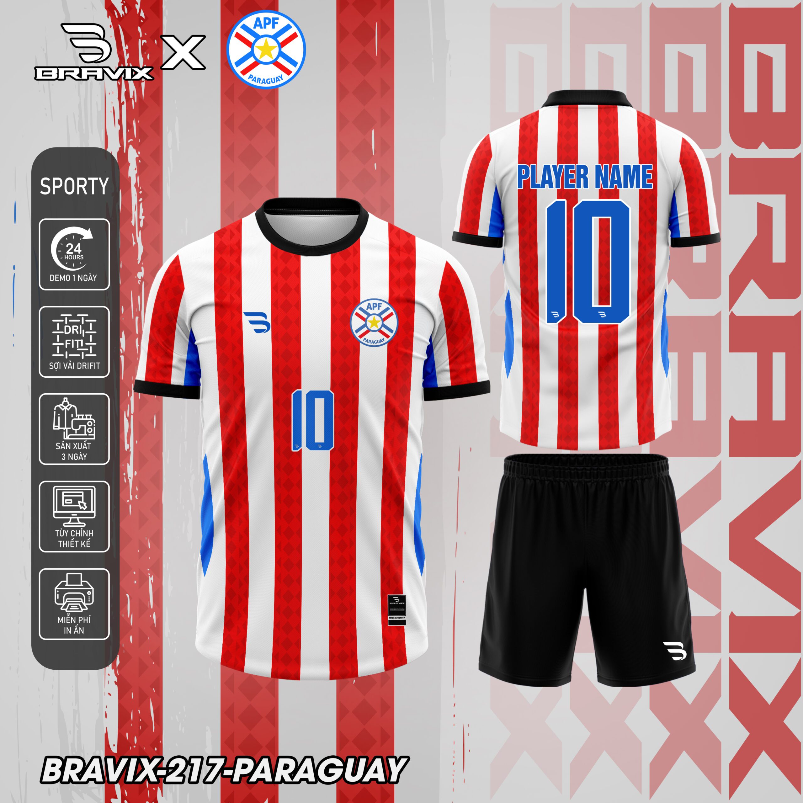 Mẫu Paraguay World Cup BRAVIX-307 mang phong cách cổ điển đặc trưng của bóng đá Nam Mỹ với các sọc đỏ – trắng chạy dọc toàn thân áo. Thiết kế lấy cảm hứng từ màu sắc truyền thống của đội tuyển Paraguay, tạo nên một bộ kit thi đấu vừa quen thuộc vừa mạnh mẽ trên sân cỏ.