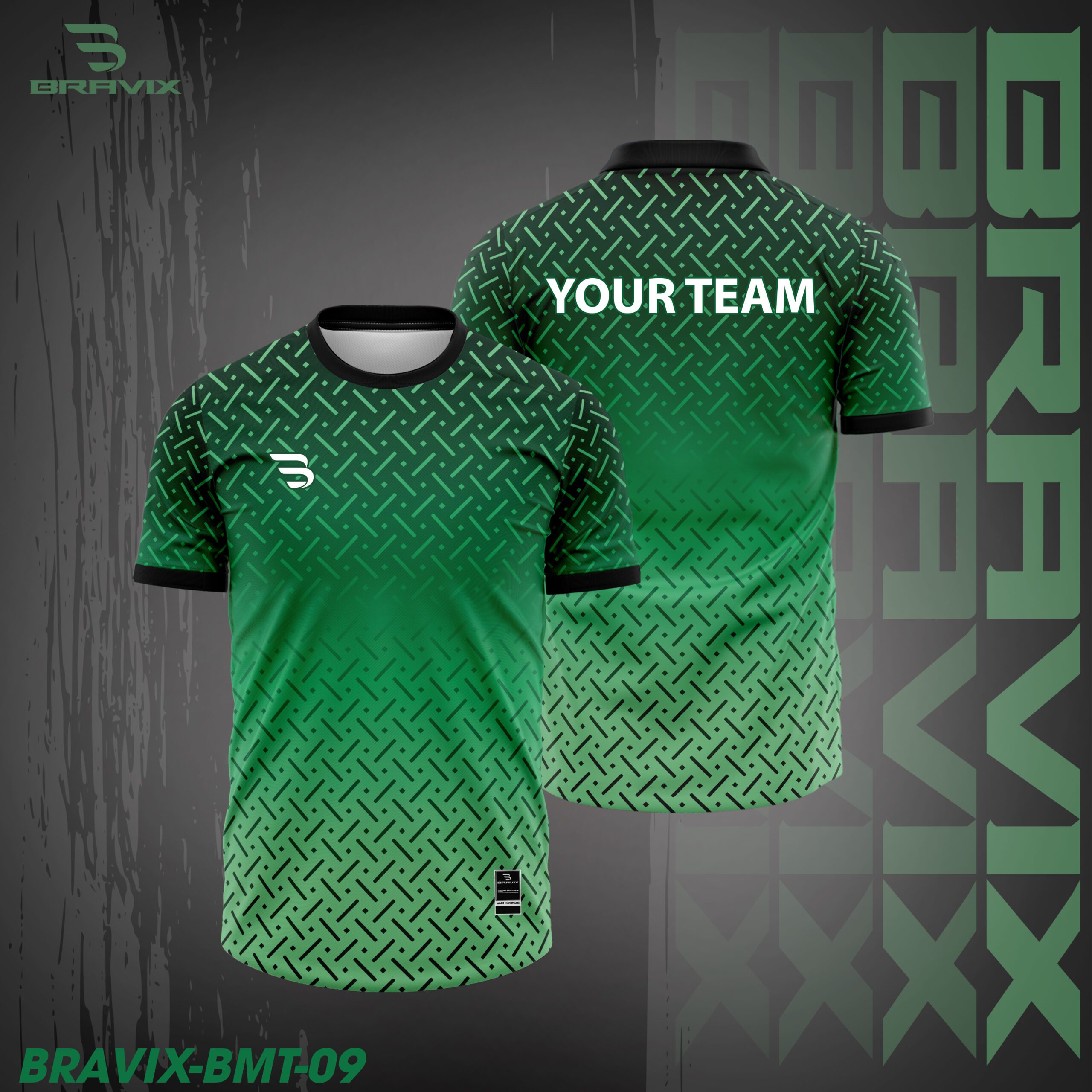 Áo cầu lông BRAVIX BMT-09 sở hữu tông xanh lá nổi bật kết hợp hiệu ứng gradient chuyển sắc nhẹ nhàng từ đậm sang sáng, tạo nên cảm giác tươi mới và đầy năng lượng trên sân cầu.