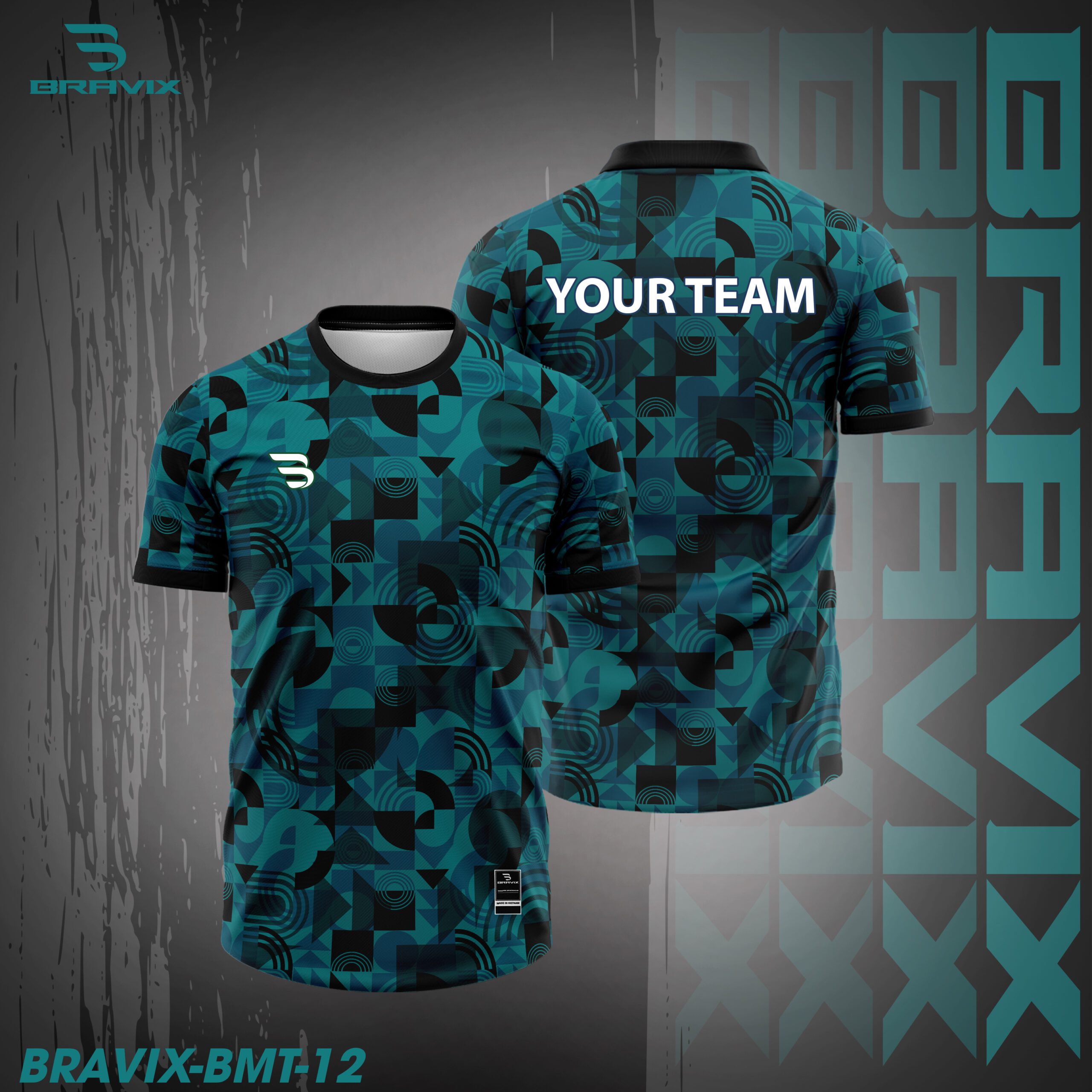 Áo cầu lông BRAVIX BMT-12 sở hữu thiết kế hiện đại với tông xanh teal chủ đạo kết hợp các họa tiết geometric và abstract layered độc đáo. Sự kết hợp giữa các mảng hình học và đường cong tạo nên chiều sâu thị giác mạnh mẽ, giúp chiếc áo nổi bật ngay cả khi thi đấu trên sân.