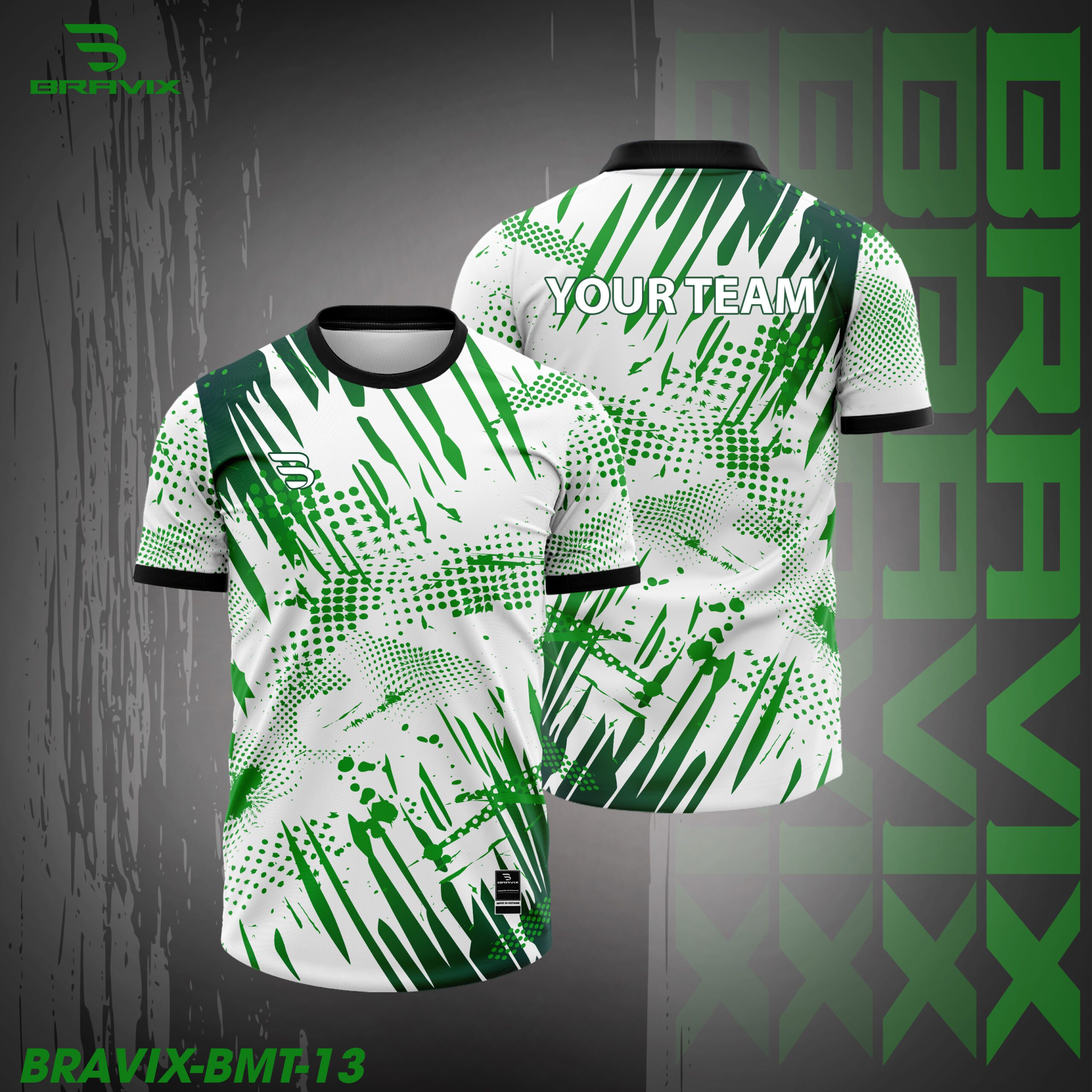 Áo cầu lông BRAVIX BMT-13 nổi bật với tông trắng chủ đạo kết hợp các mảng graphic xanh lá mạnh mẽ, tạo nên phong cách thể thao trẻ trung và đầy năng lượng. Thiết kế sử dụng các nét brush stroke kết hợp hiệu ứng splash và halftone dots, mang lại cảm giác chuyển động và tốc độ đặc trưng của các môn thể thao đối kháng như cầu lông.