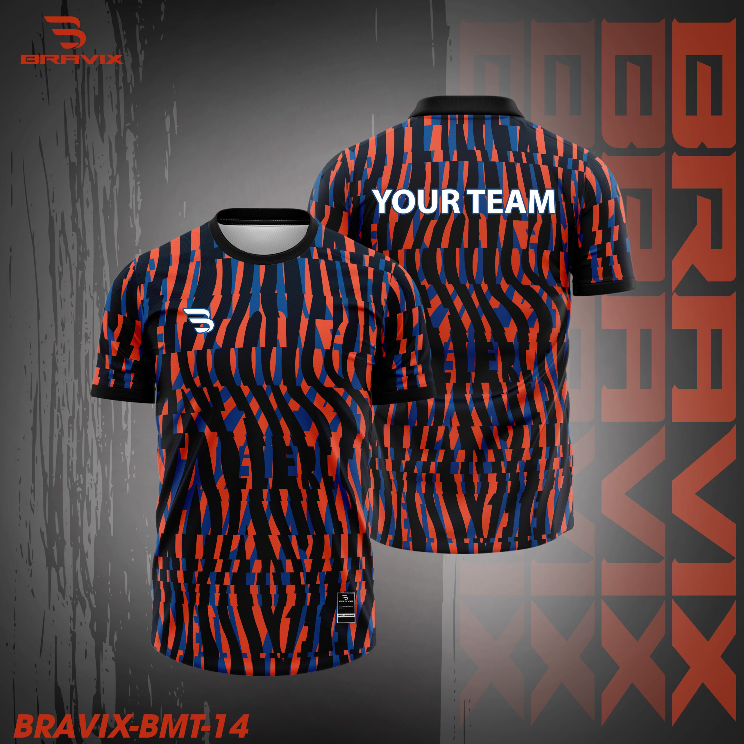 Áo cầu lông BRAVIX BMT-14 sở hữu thiết kế nổi bật với sự kết hợp giữa hai tông màu mạnh mẽ: xanh navy và cam rực rỡ. Pattern dạng wave stripe được sắp xếp liên tục trên toàn bộ thân áo, tạo hiệu ứng chuyển động độc đáo và mang lại cảm giác tốc độ khi thi đấu.