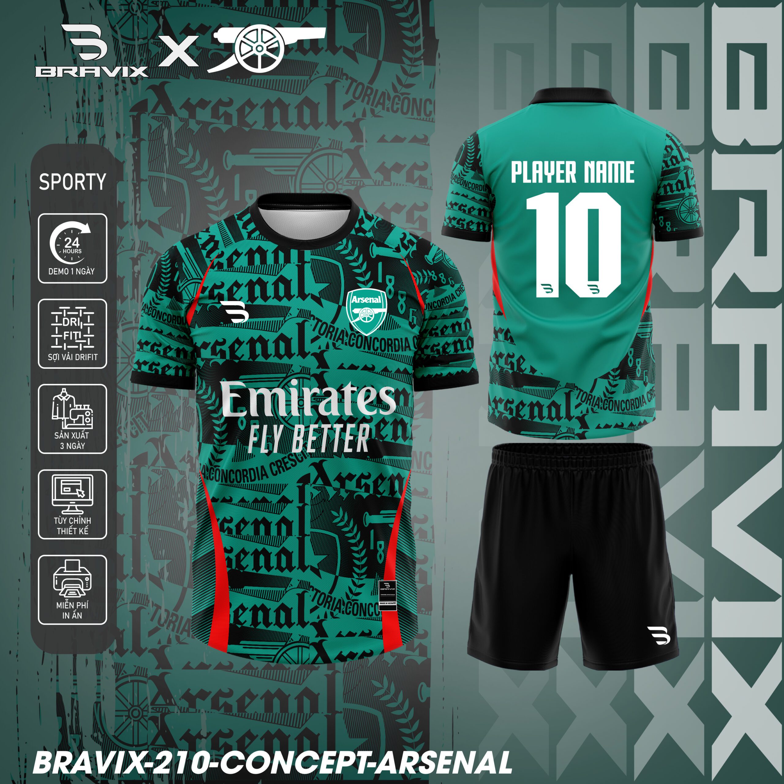 Bravix 210 Concept Arsenal là mẫu áo bóng đá được thiết kế theo phong cách hiện đại với tông màu xanh lá chủ đạo kết hợp cùng các chi tiết đen và đỏ nổi bật. Sự phối màu này mang lại vẻ ngoài mạnh mẽ, năng động và rất dễ nhận diện trên sân bóng.