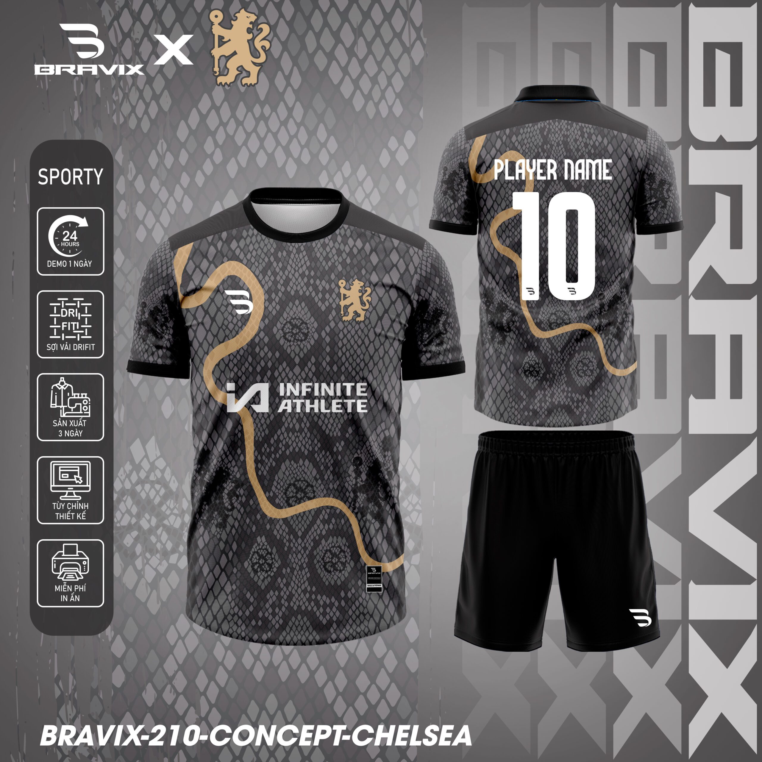 Bravix 210 Concept Chelsea là mẫu áo bóng đá được thiết kế theo phong cách hiện đại với tông màu xám chủ đạo. Thiết kế mang lại cảm giác mạnh mẽ, cá tính và tạo nên sự khác biệt so với những mẫu áo bóng đá truyền thống.