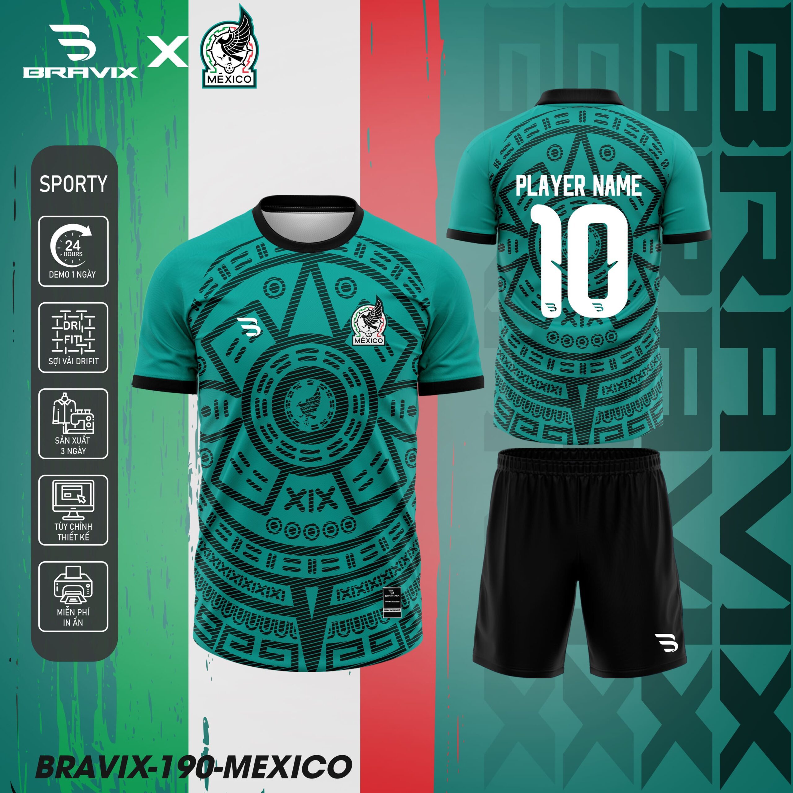 Mẫu “Mexico” của BRAVIX lấy cảm hứng từ sắc đen huyền bí và hoa văn Aztec mạnh mẽ, kết hợp logo đại bàng Mexico đầy uy lực. Tổng thể tạo nên cảm giác chiến binh, phù hợp với những đội bóng thích phong cách ngầu, chắc, và đầy bản lĩnh.