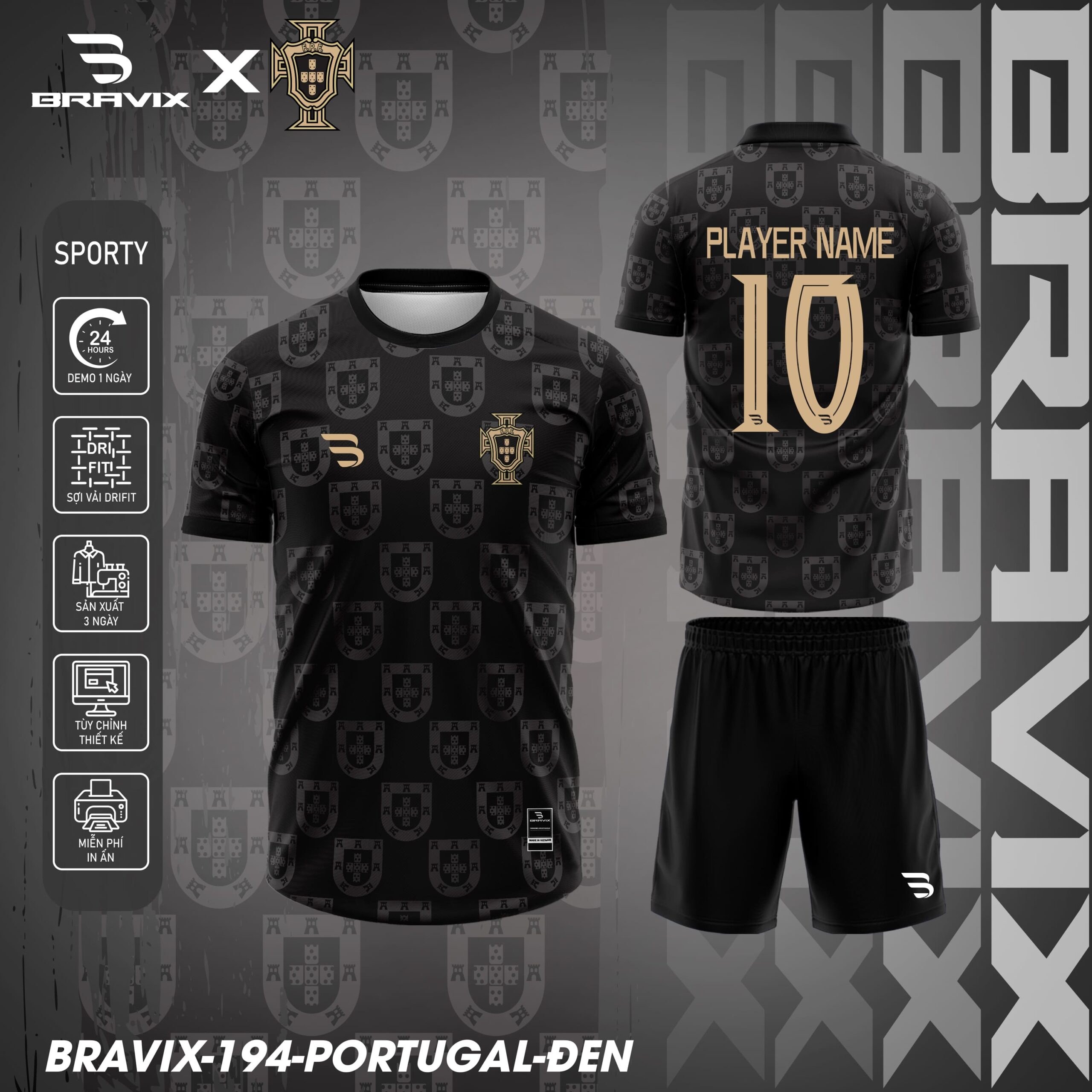 Mẫu “Portugal” – Black Royal Edition của BRAVIX lấy cảm hứng từ đội tuyển Bồ Đào Nha với tông đen chủ đạo kết hợp chi tiết logo vàng đồng sang trọng. Họa tiết quốc huy Portugal được lặp chìm trên toàn thân áo, tạo hiệu ứng hoàng gia nhưng vẫn giữ được sự mạnh mẽ, hiện đại.