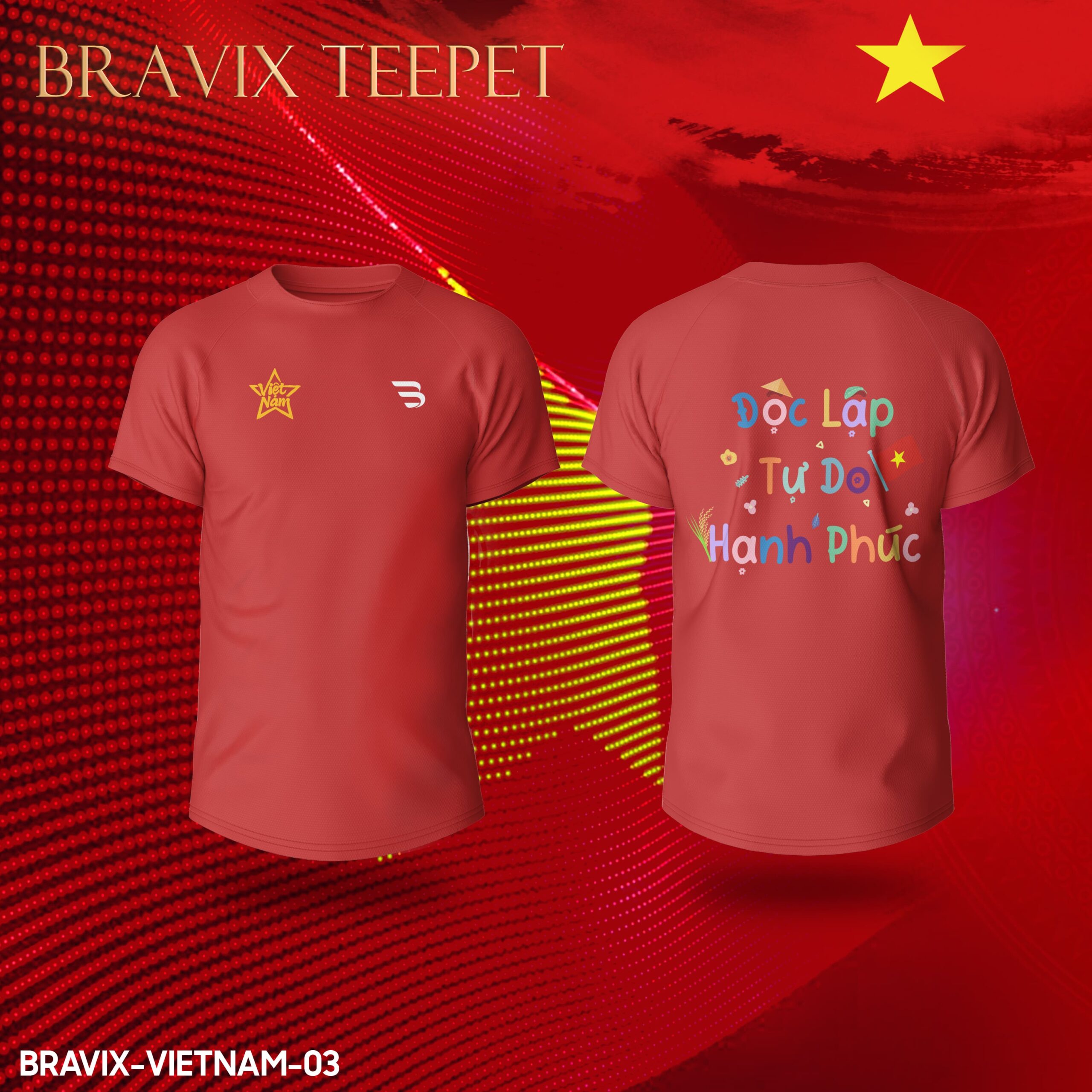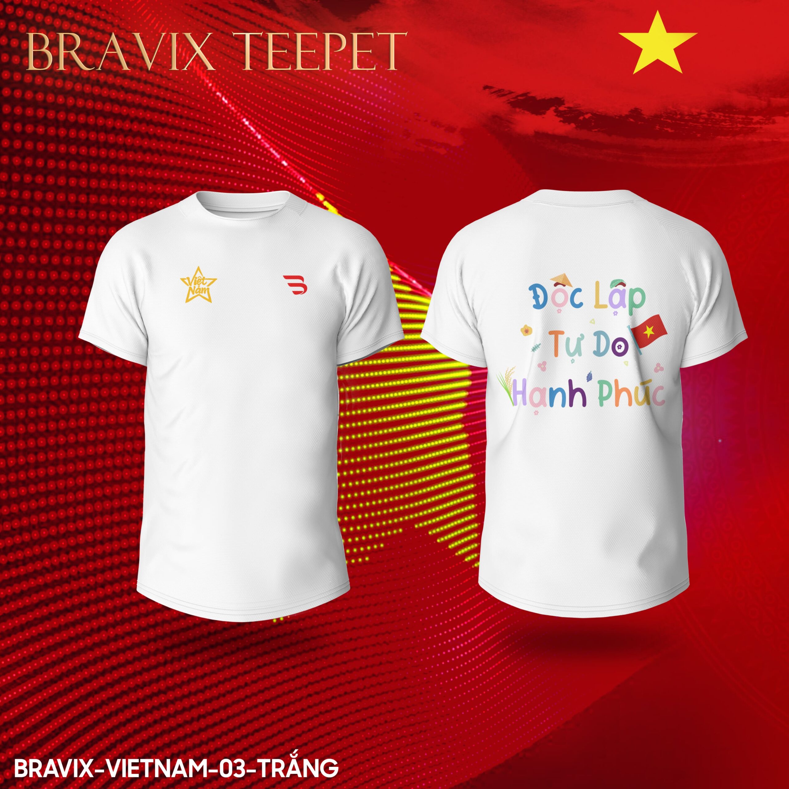 Mẫu “Độc Lập – Tự Do – Hạnh Phúc” thuộc dòng TeePet chủ đề Việt Nam của Bravix, mang phong cách trẻ trung – tươi sáng – giàu giá trị tinh thần. Bộ chữ được phối màu đa sắc vui nhộn, điểm thêm họa tiết nhỏ như hoa, ngôi sao, cờ Việt Nam… giúp thiết kế trở nên sống động, thân thiện và dễ thương.