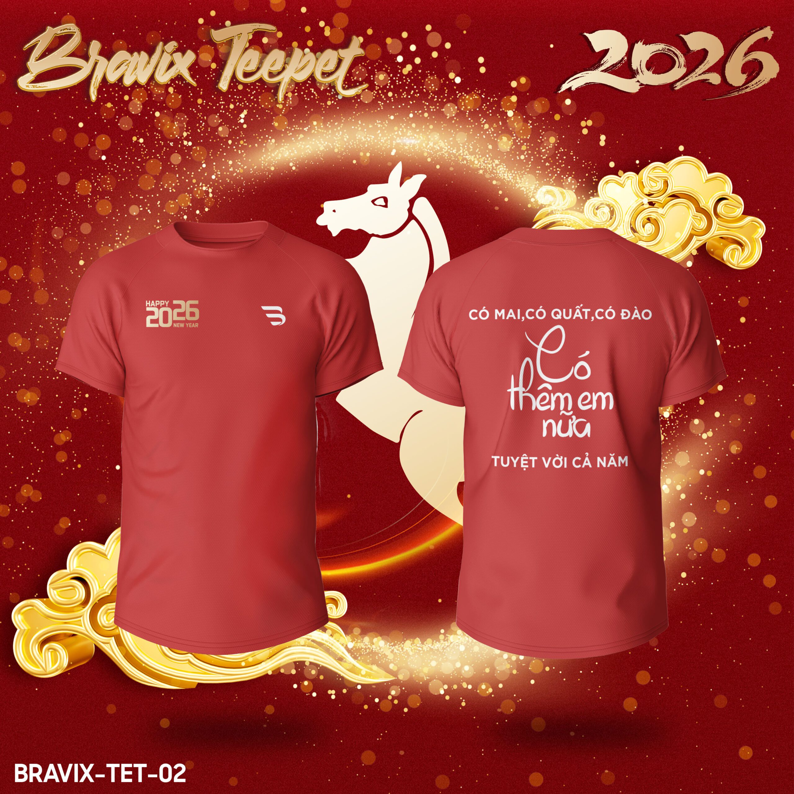 • Thiết kế độc quyền với logo “HAPPY 2026 NEW YEAR” và logo Bravix phía trước ngực.