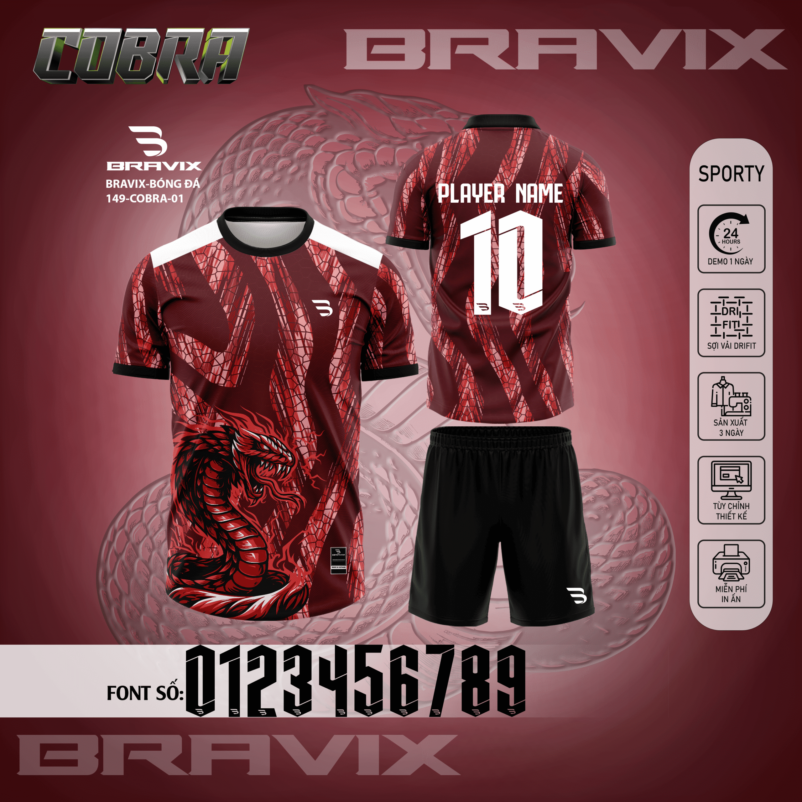BST Cobra của Bravix là dòng sản phẩm áo bóng đá thiết kế cao cấp lấy cảm hứng từ rắn hổ mang (cobra) – biểu tượng của sức mạnh, sự nguy hiểm và bản năng săn mồi. Với họa tiết rắn cobra uốn lượn đầy uy lực, vảy rắn (snake scales) chi tiết sắc nét, và bảng màu đỏ đô (maroon/burgundy) huyền bí, BST Cobra mang đến phong cách mạnh mẽ, độc đáo và đầy cá tính cho các chiến binh trên sân cỏ.