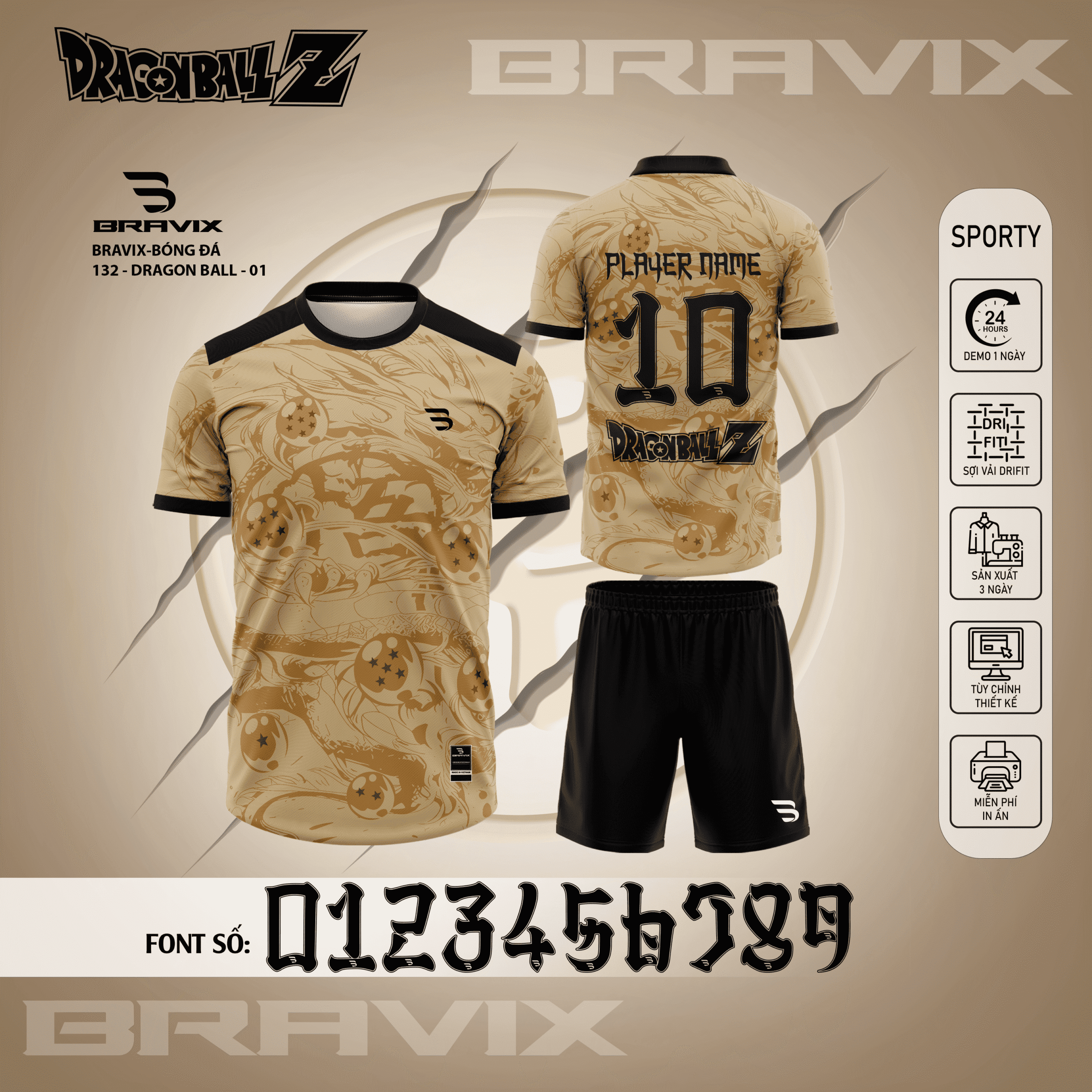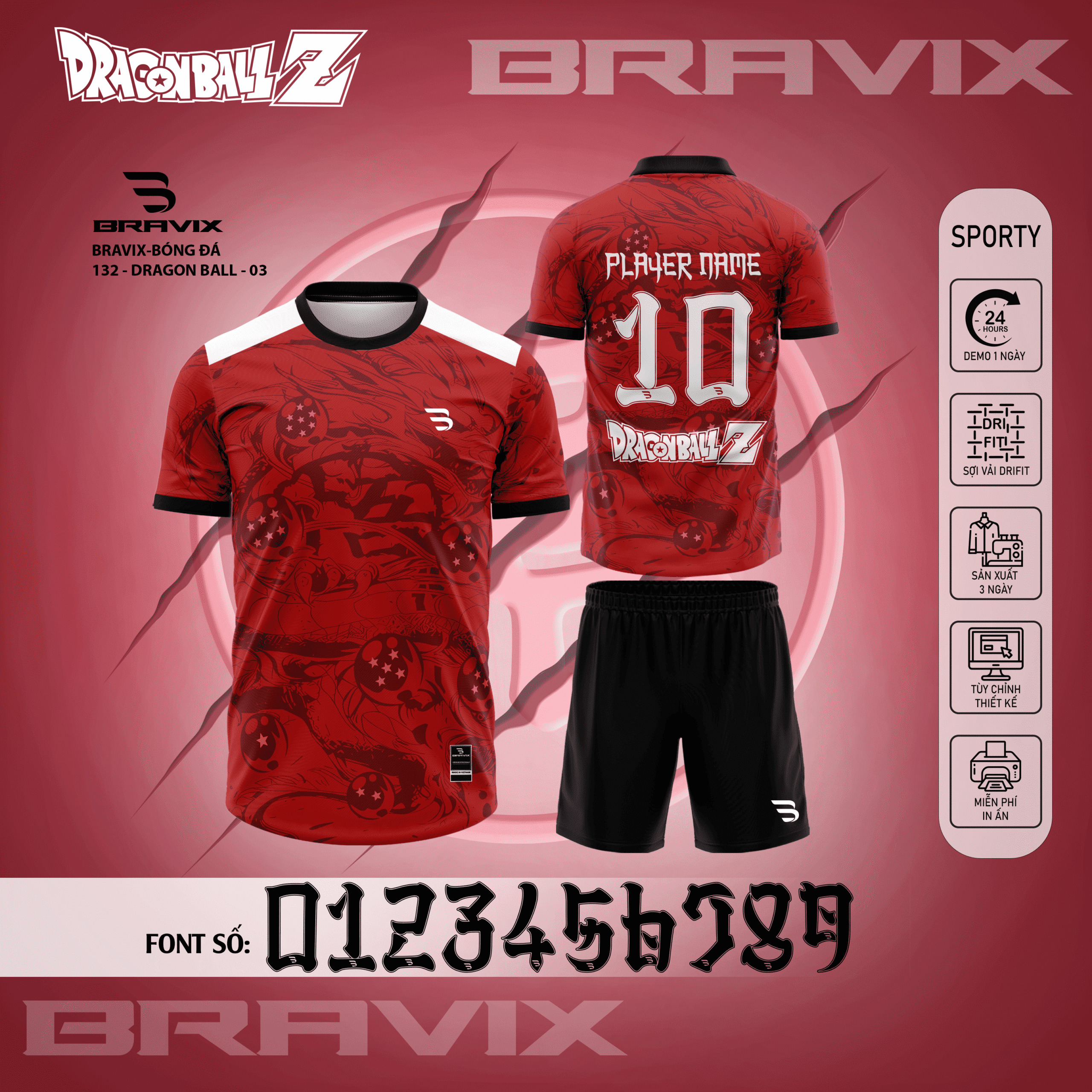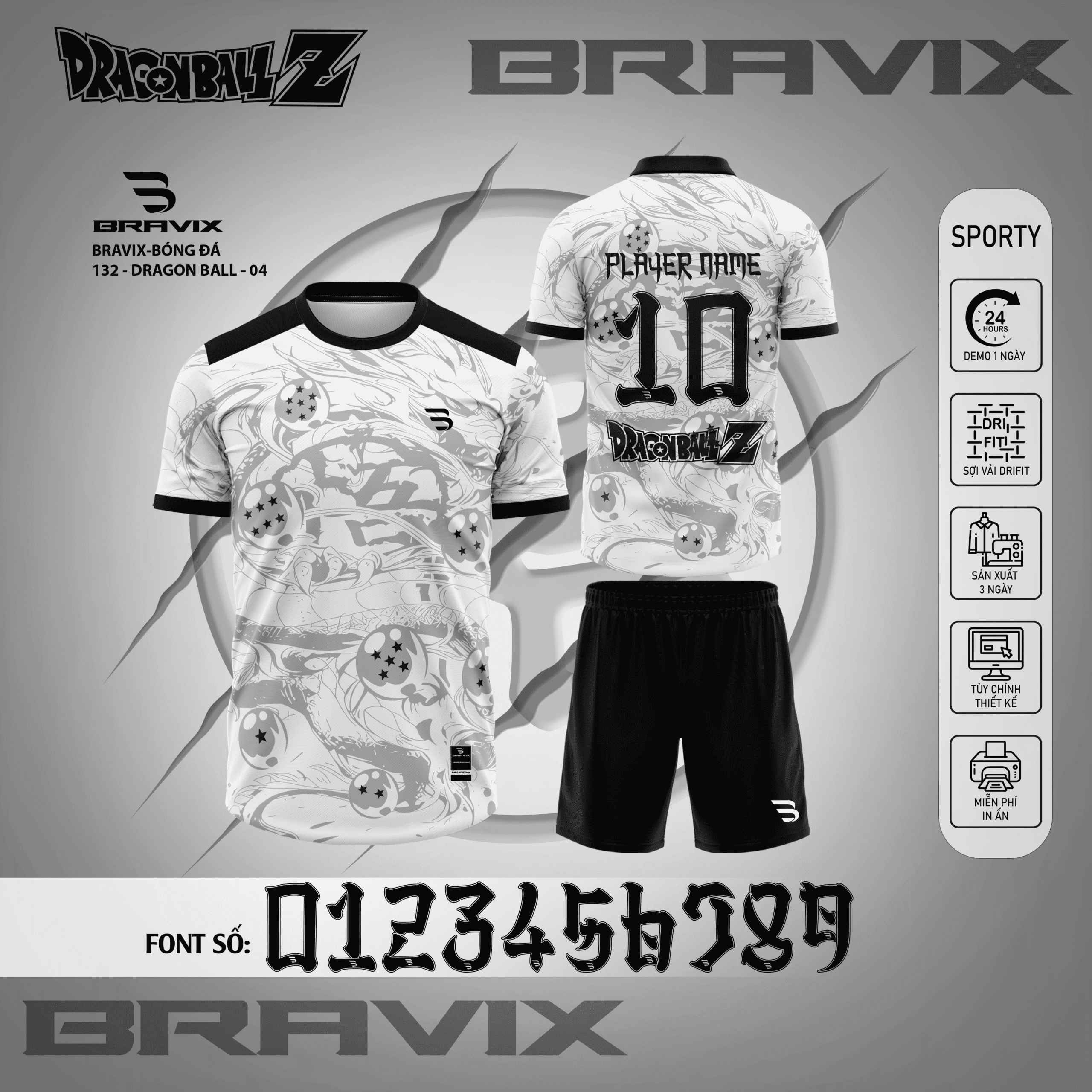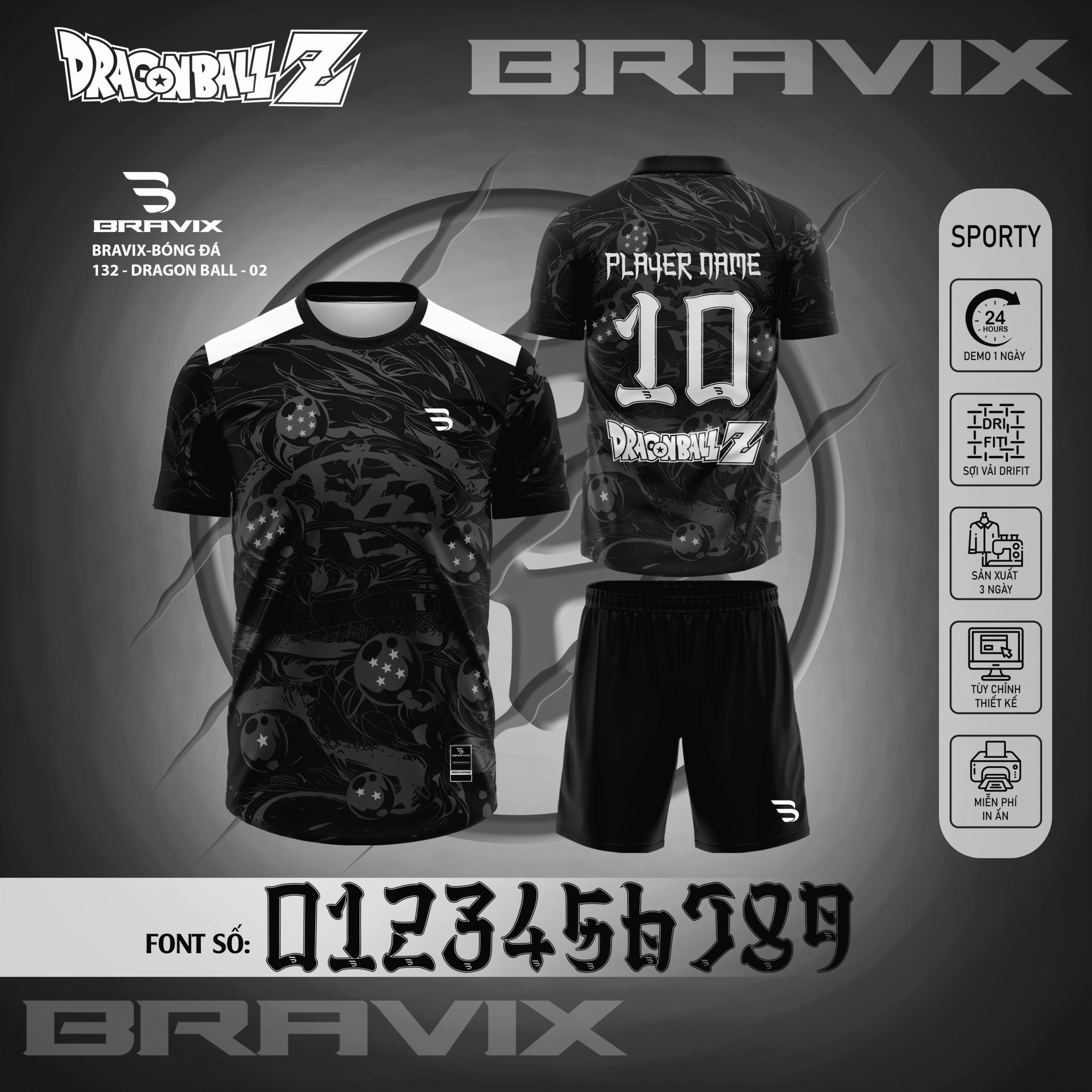 • Font số phong cách Dragon Ball (0123456789) độc đáo, hỗ trợ in tên và số áo cầu thủ theo yêu cầu.