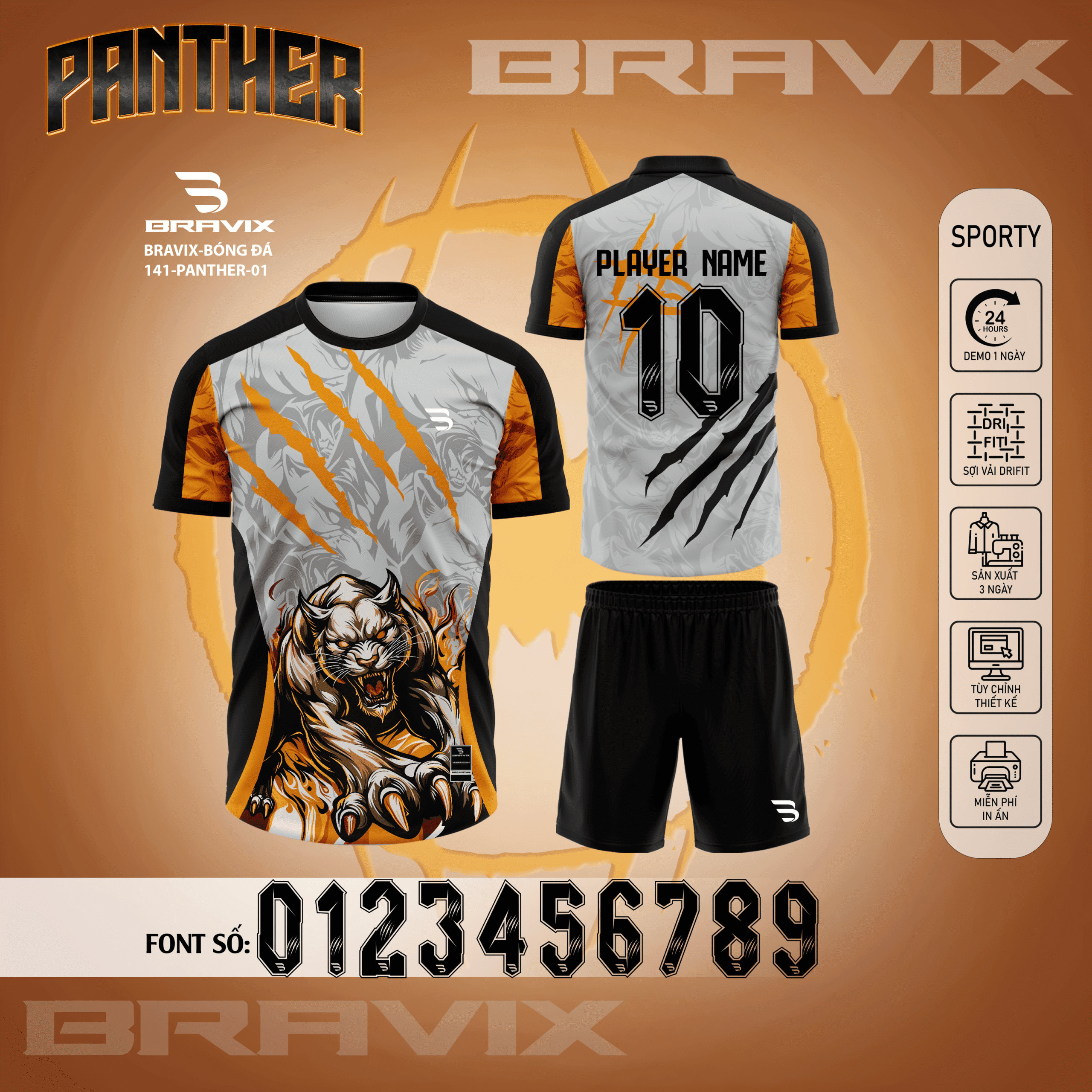 - Font số phong cách Panther (0123456789) mạnh mẽ, hiện đại, hỗ trợ in tên và số áo cầu thủ theo yêu cầu.
