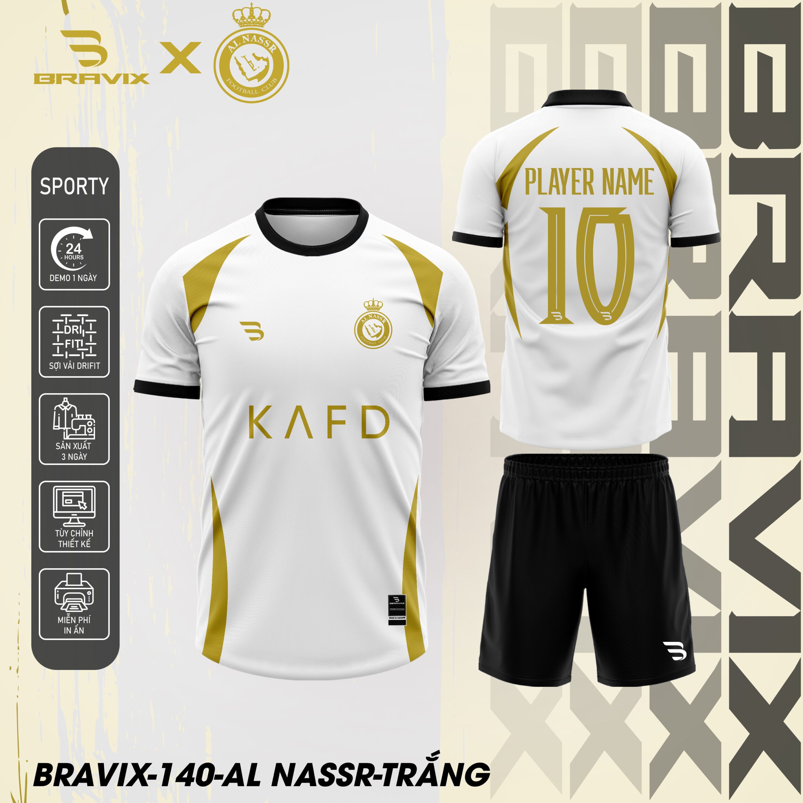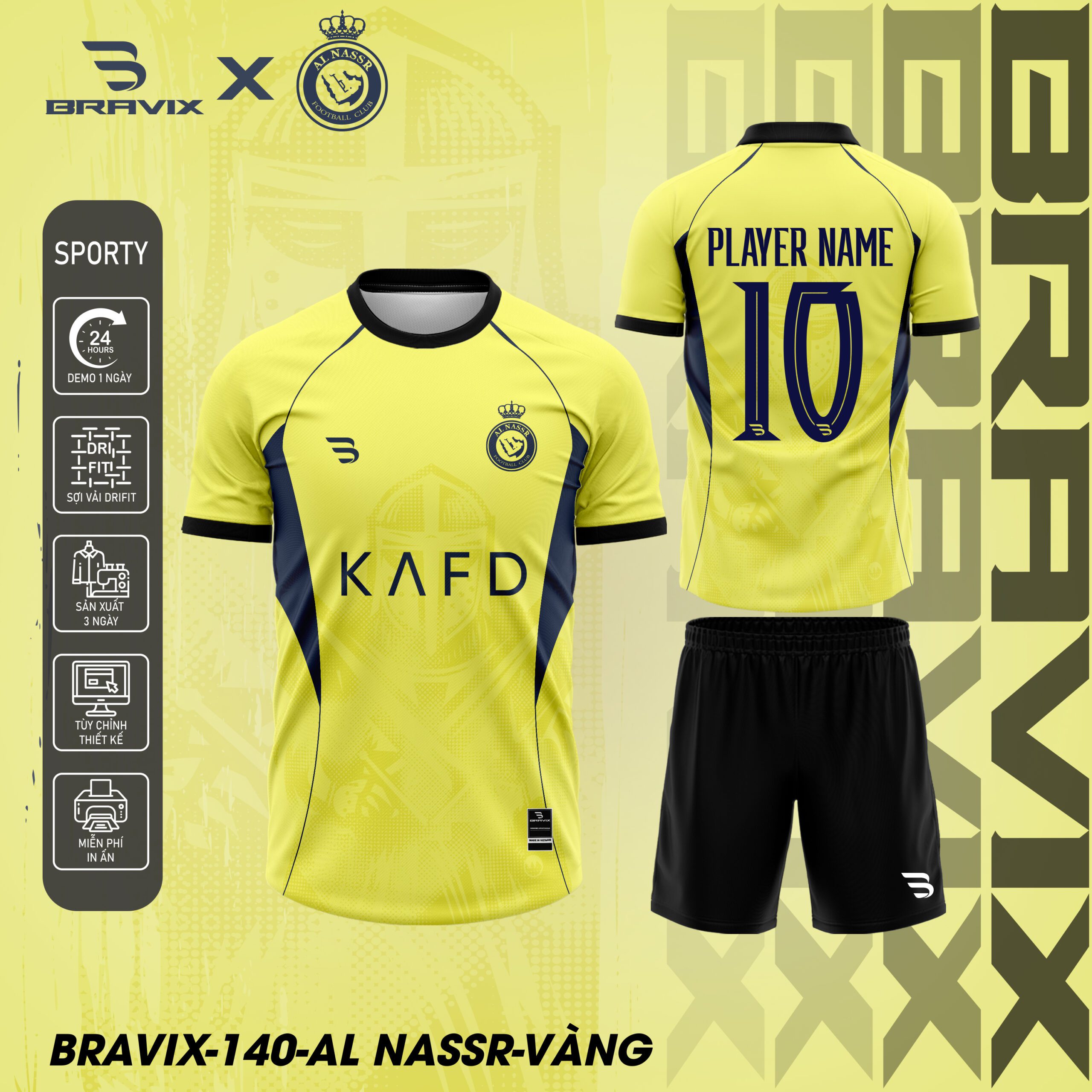 Mẫu Al Nassr của Bravix là dòng sản phẩm áo bóng đá thiết kế cao cấp lấy cảm hứng từ Al Nassr FC – câu lạc bộ bóng đá huyền thoại của Ả Rập Saudi, biểu tượng của màu vàng hoàng gia, tinh thần “Alami” (toàn cầu), và ngôi nhà của Cristiano Ronaldo. Với họa tiết logo Al Nassr với vương miện hoàng gia, chữ “KAFD” nhà tài trợ, viền vàng sang trọng, và 3 phiên bản màu sắc (trắng, vàng, xanh đen), mẫu này mang đến phong cách hoàng gia, đẳng cấp và đầy sức mạnh cho các chiến binh trên sân cỏ.