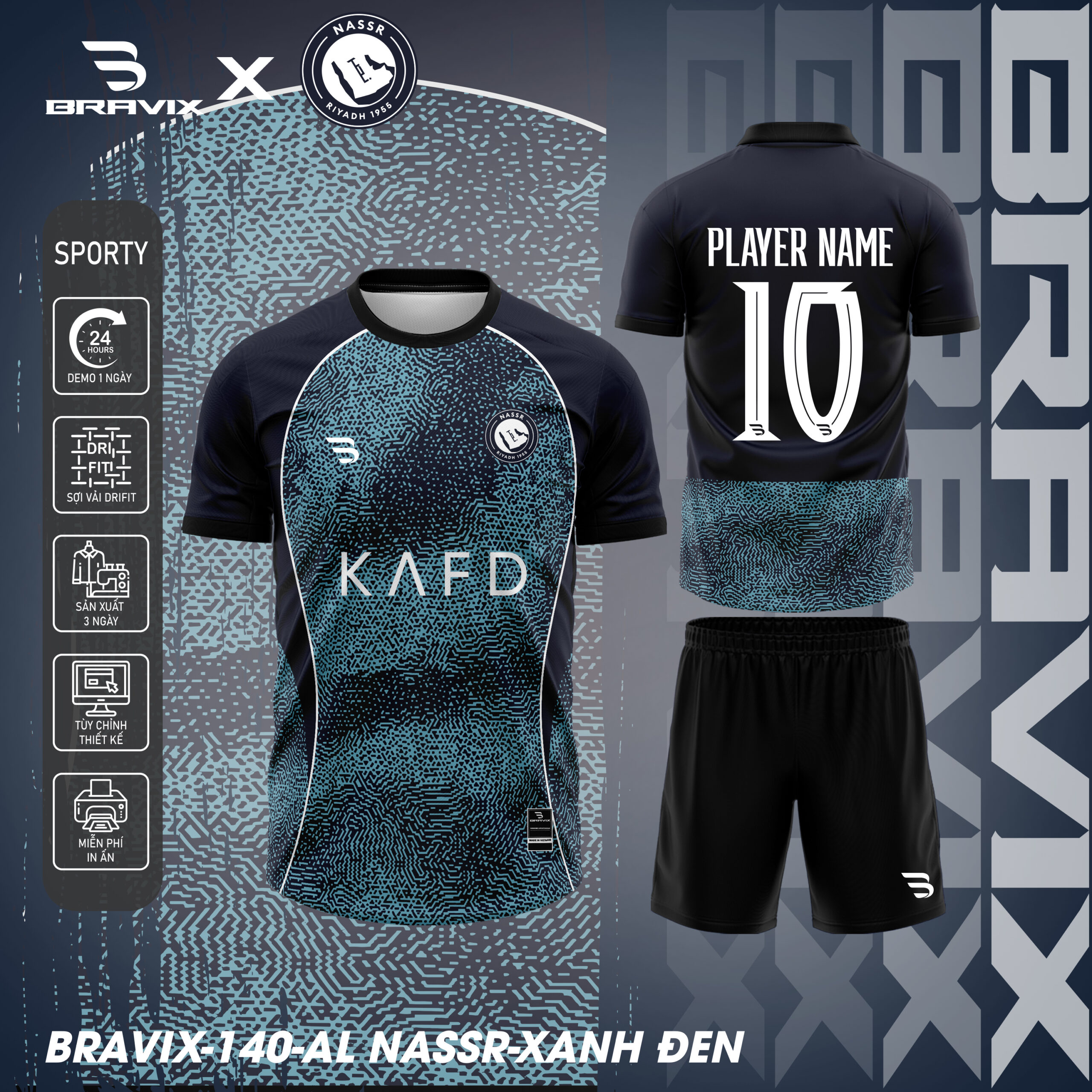 - Thiết kế lấy cảm hứng từ Al Nassr với logo Al Nassr (vương miện hoàng gia Saudi) trên ngực, chữ “KAFD” ở giữa áo (King Abdullah Financial District – nhà tài trợ), viền vàng hoàng gia (phiên bản trắng), họa tiết digital pattern (phiên bản xanh đen), in chuyển nhiệt sắc nét.