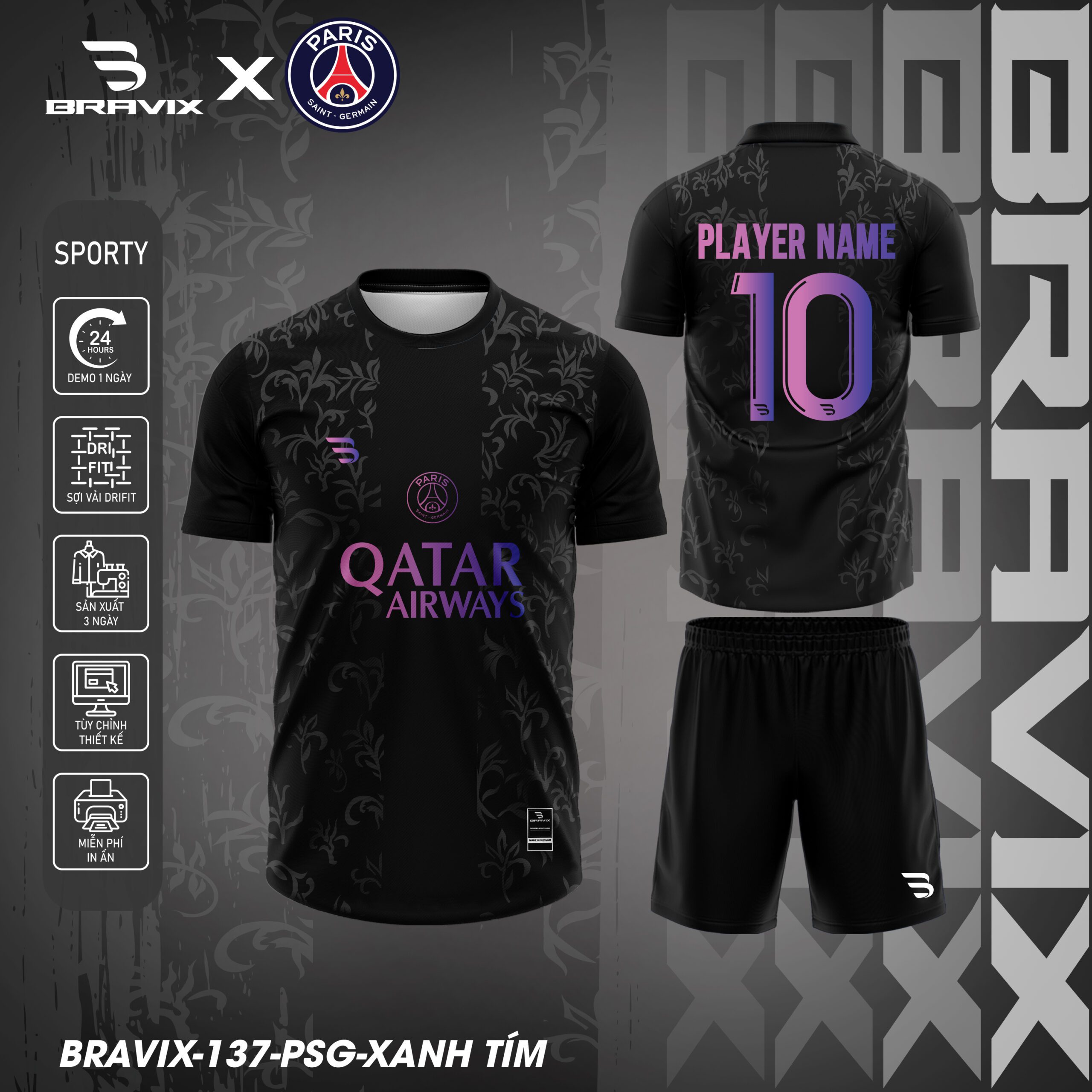 Mẫu PSG của Bravix là dòng sản phẩm áo bóng đá thiết kế cao cấp lấy cảm hứng từ Paris Saint-Germain – câu lạc bộ bóng đá huyền thoại của Pháp, biểu tượng của màu xanh navy và đỏ, tinh thần “Ici C’est Paris” (Đây là Paris), và ngôi nhà của những siêu sao toàn cầu. Với họa tiết logo PSG với tháp Eiffel, chữ “Qatar Airways” nhà tài trợ, họa tiết fleur-de-lis hoàng gia Pháp, và 3 phiên bản màu sắc (đen, trắng, xanh tím), mẫu này mang đến phong cách hoàng gia, đẳng cấp và đầy quyền lực Paris cho các chiến binh trên sân cỏ.