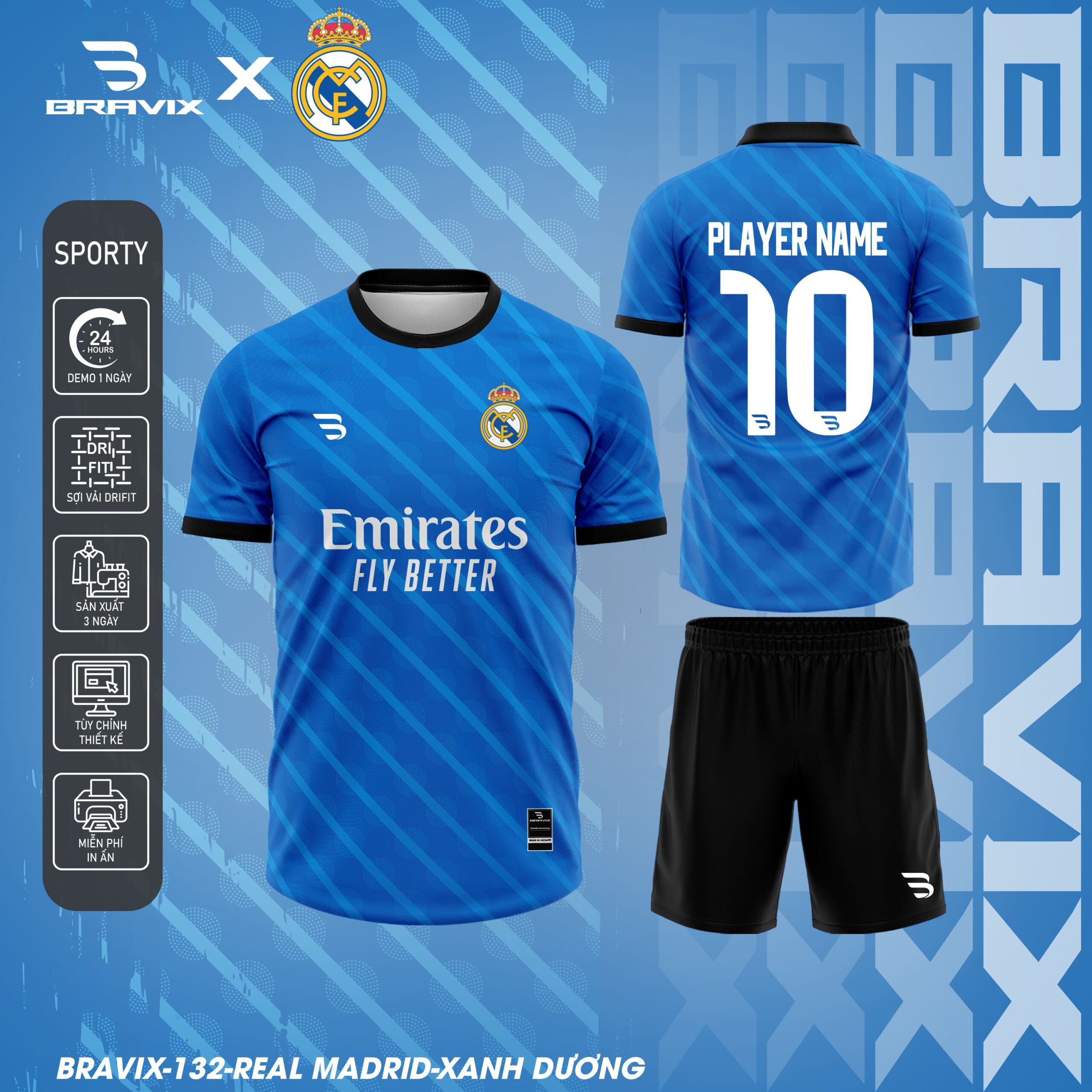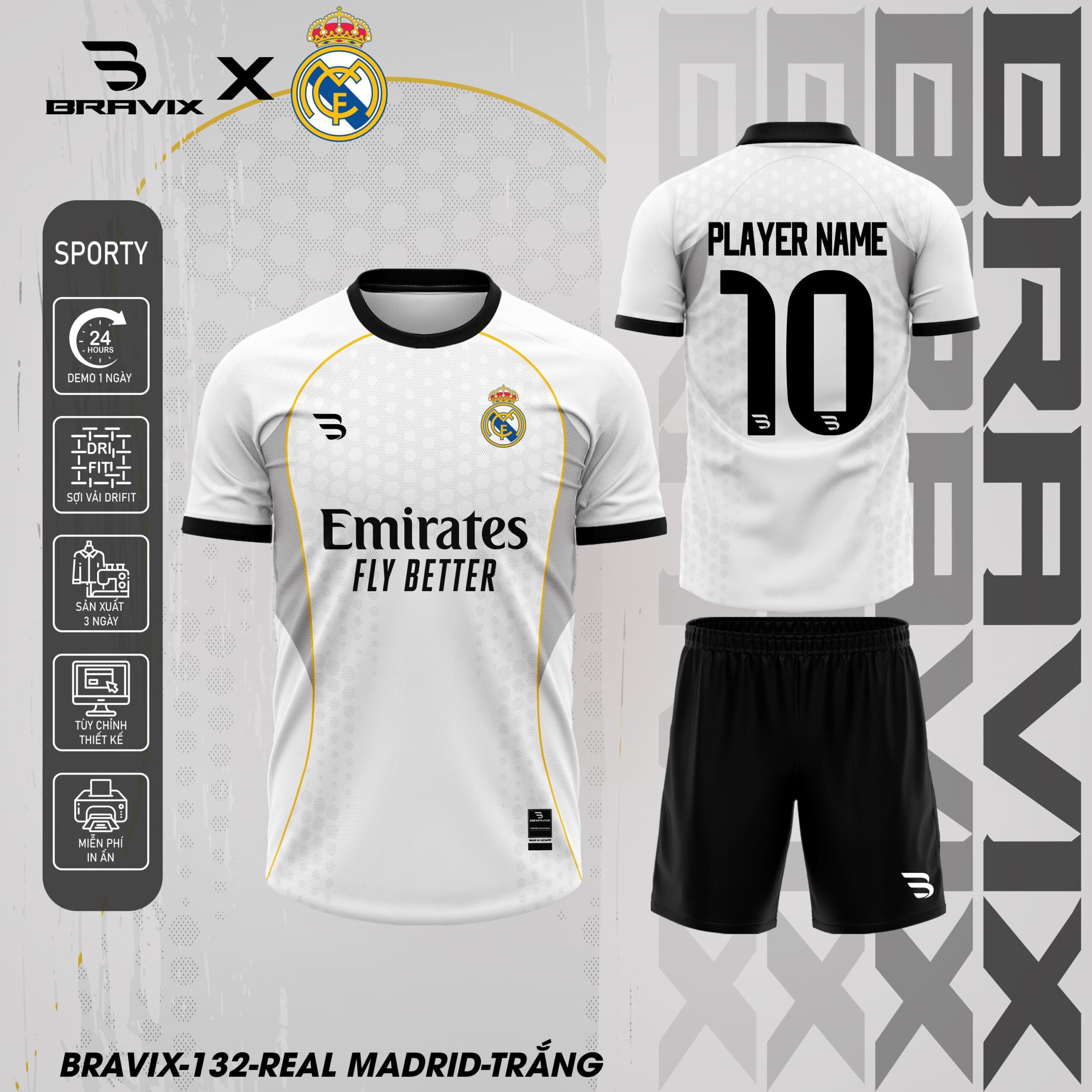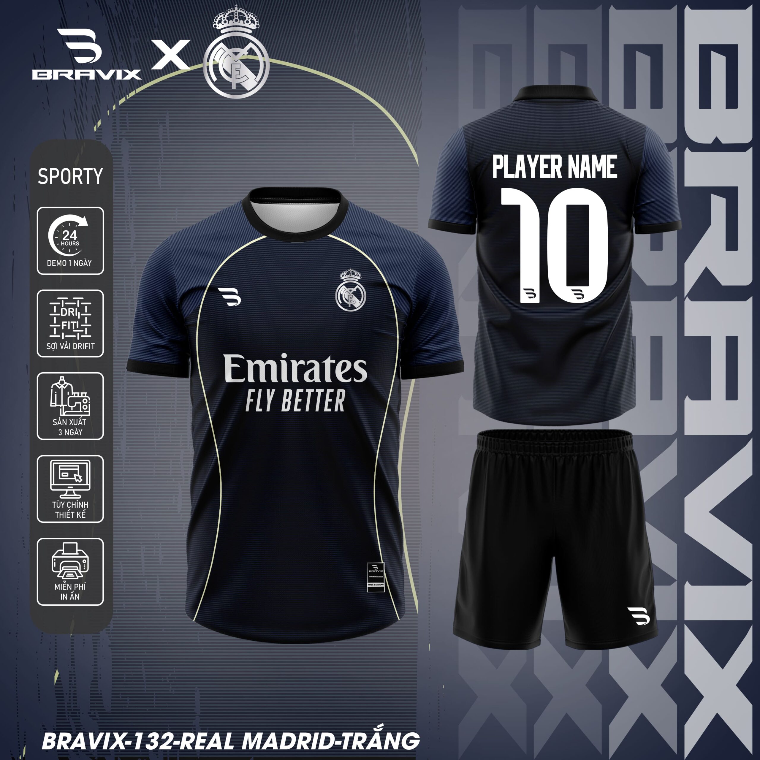 Mẫu Real Madrid của Bravix là dòng sản phẩm áo bóng đá thiết kế cao cấp lấy cảm hứng từ Real Madrid – câu lạc bộ bóng đá vĩ đại nhất mọi thời đại, biểu tượng của 15 chức vô địch Champions League, tinh thần “Hala Madrid” bất diệt, và triết lý bóng đá hoàng gia. Với họa tiết logo Real Madrid huyền thoại, chữ “Emirates Fly Better” nhà tài trợ, viền vàng hoàng gia, và nhiều phiên bản màu sắc (trắng, xanh đen, xanh dương), mẫu mang đến phong cách đẳng cấp, hoàng gia và đầy vinh quang cho các chiến binh trên sân cỏ.
