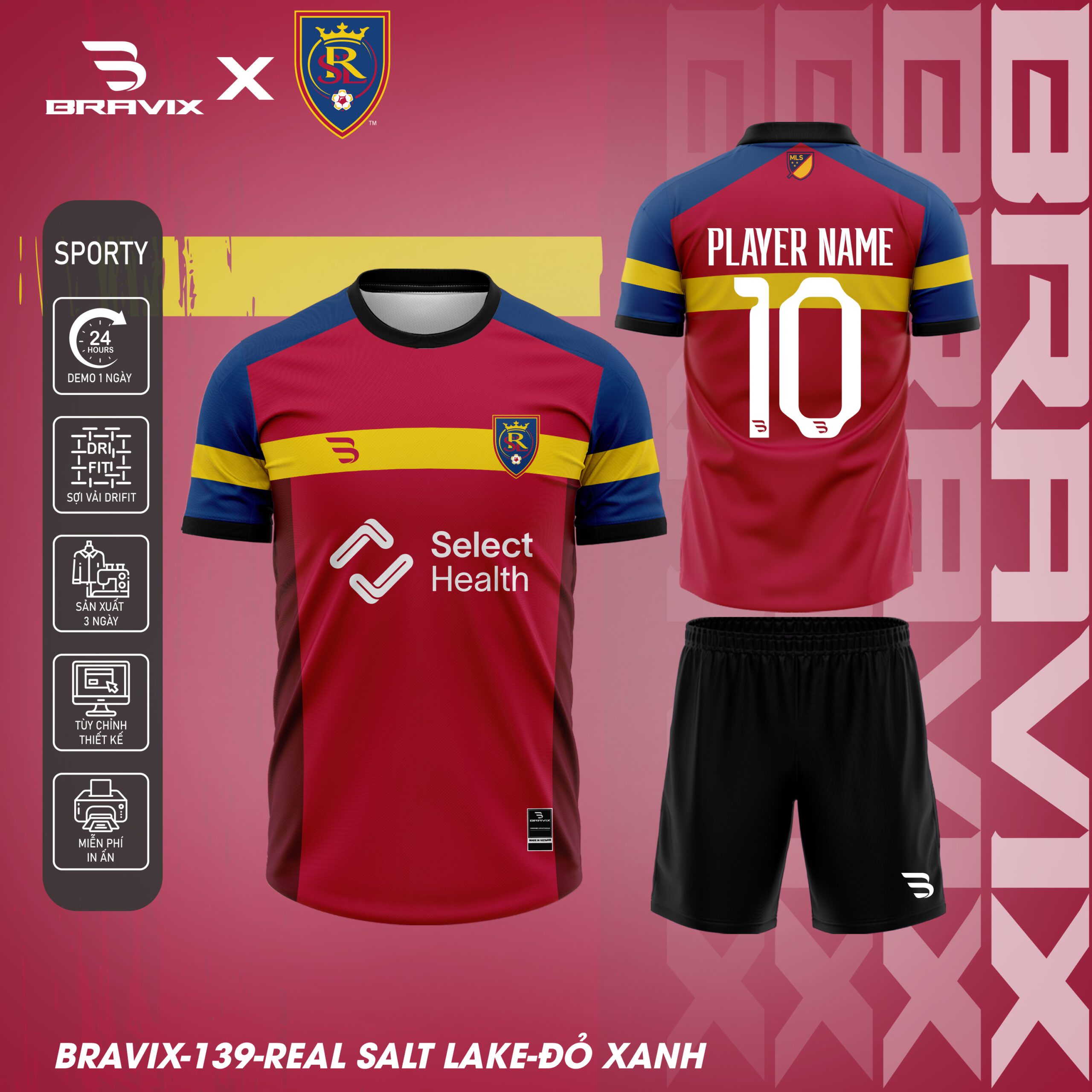 Mẫu Real Salt Lake của Bravix là dòng sản phẩm áo bóng đá thiết kế cao cấp lấy cảm hứng từ Real Salt Lake – câu lạc bộ bóng đá MLS của Utah, biểu tượng của màu đỏ claret và xanh cobalt, tinh thần “Believe” (tin tưởng), và văn hóa bóng đá miền núi Rocky Mountains. Với họa tiết logo RSL với vương miện, chữ “Select Health” nhà tài trợ, sọc ngang đỏ-vàng-xanh đặc trưng, và 2 phiên bản màu sắc (đỏ xanh, trắng xanh), mẫu này mang đến phong cách hoàng gia, mạnh mẽ và đầy tự hào Utah cho các chiến binh trên sân cỏ.