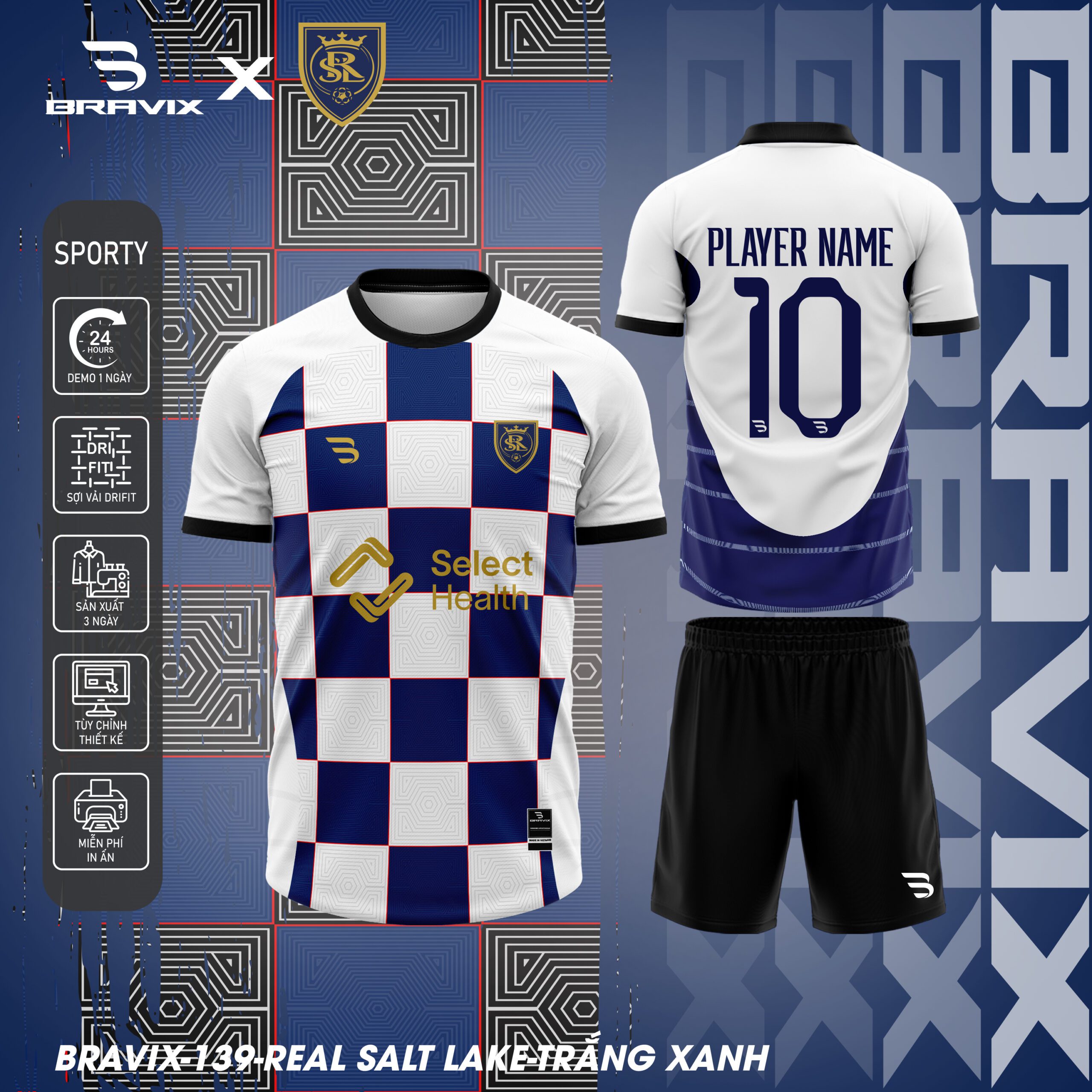 - Thiết kế lấy cảm hứng từ RSL với logo Real Salt Lake (vương miện và chữ R) trên ngực, chữ “Select Health” ở giữa áo (tổ chức y tế nhà tài trợ), sọc ngang claret-vàng-cobalt đặc trưng, họa tiết checkerboard (phiên bản trắng xanh), viền xanh raglan, in chuyển nhiệt sắc nét.